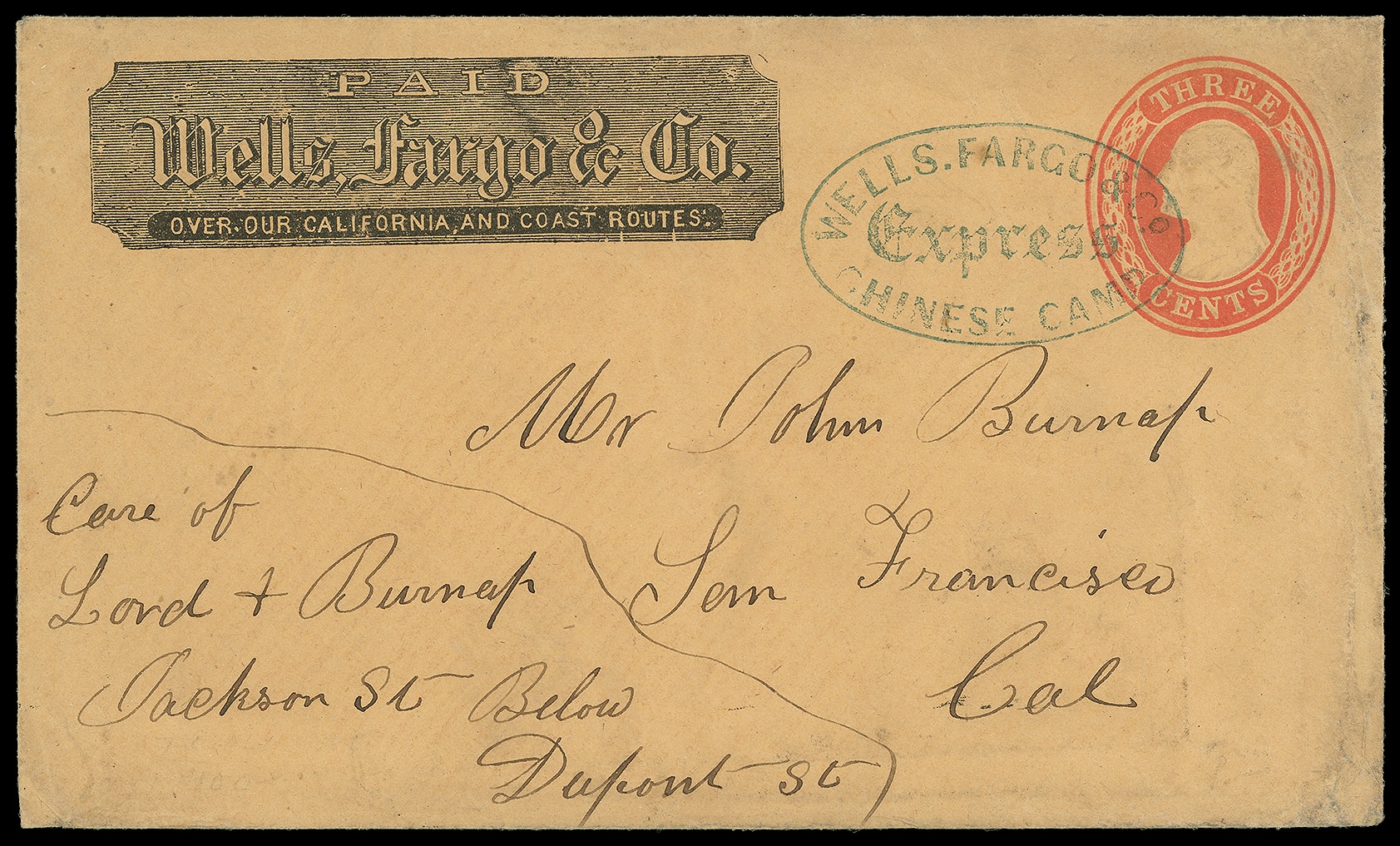 Express Chinese Camp. Blue oval (Leutzinger 03-01) with printed Wells Fargo frank on 3¢ red (U10) Nesbitt buff entire to San Francisco Cal., Very Fine, Only five recorded examples in Thomas, ex-Blaine. Thomas
