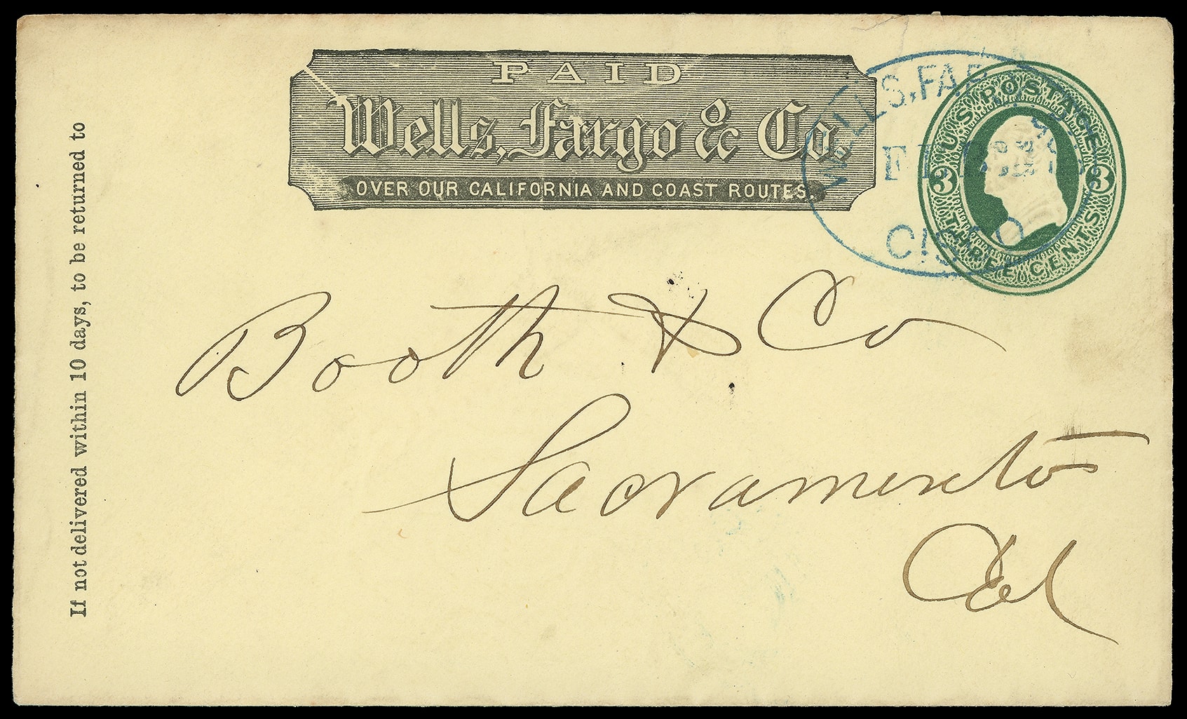 Cisco, Feb. Complete blue oval datestamp (Leutzinger 11-09) with Wells Fargo & Co. printed frank on 3¢ green (U84) amber entire to Sacramento Cal., Very Fine, Two or fewer reported examples in the Thomas census.,