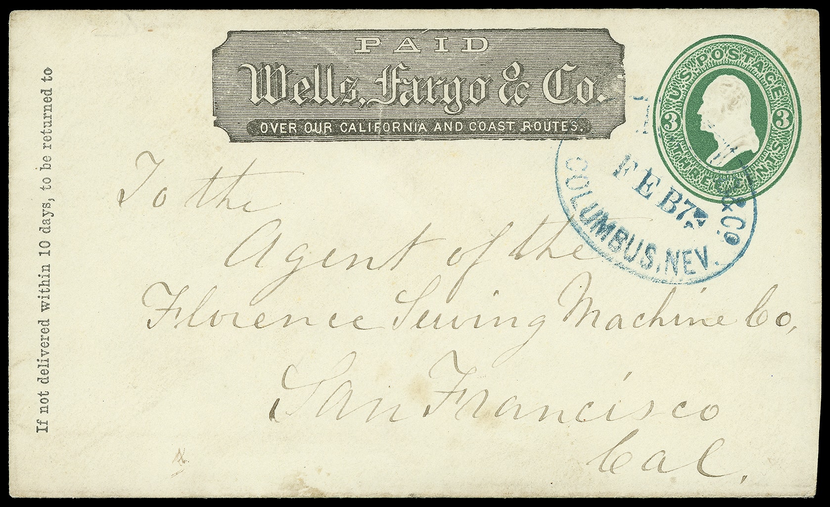 Columbus, Nev. Feb 7. Blue oval datestamp (Leutzinger 12-03) with printed Wells Fargo frank on 3¢ green (U82) entire to San Francisco Cal.; "Feb 23/73" docketing on reverse, Very Fine, Two or fewer reported examples in the