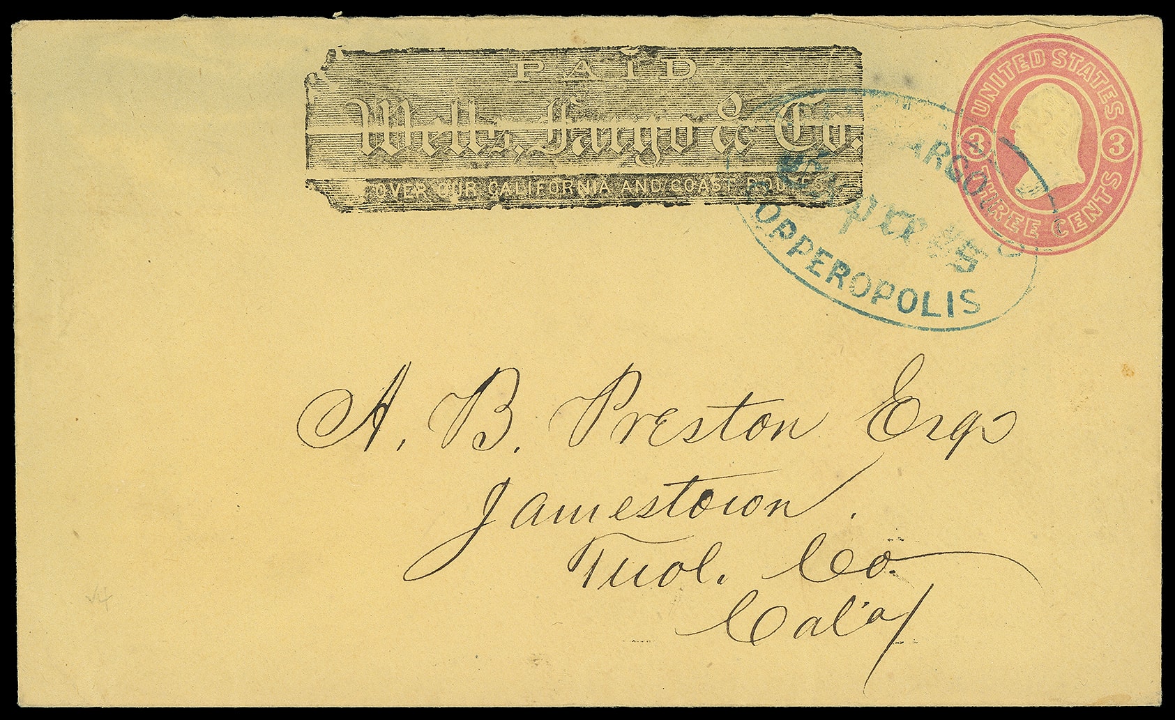 Express Copperopolis. Clear blue oval (Leutzinger 03-11) with printed Wells Fargo frank on 3¢ pink (U35) buff entire to Jamestown, Tuol. Co., Calif.; opened slightly irregular at top right, still Very Fine,