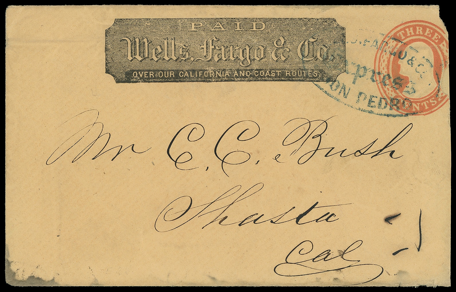 Express Don Pedro. Blue oval handstamp (Leutzinger 03-02) with printed Wells Fargo frank on 3¢ red (U10) buff Nesbitt entire to Shasta. Stain at lower left, roughly opened at right into indicium, almost Fine, two or fewer
