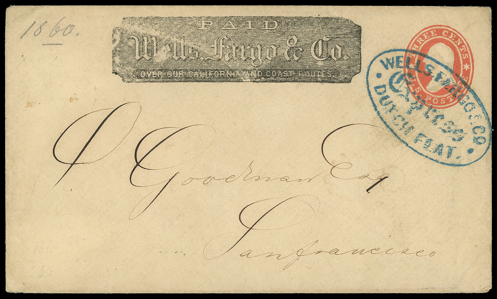 Express Dutch Flat. Bold blue oval handstamp (Leutzinger 03-02) with printed Wells Fargo frank on 3¢ red (U26) Star Die buff entire to San Francisco, Cal., Very Fine and choice, ex-Blaine. Thomas No. WFE-101; Estimate $150