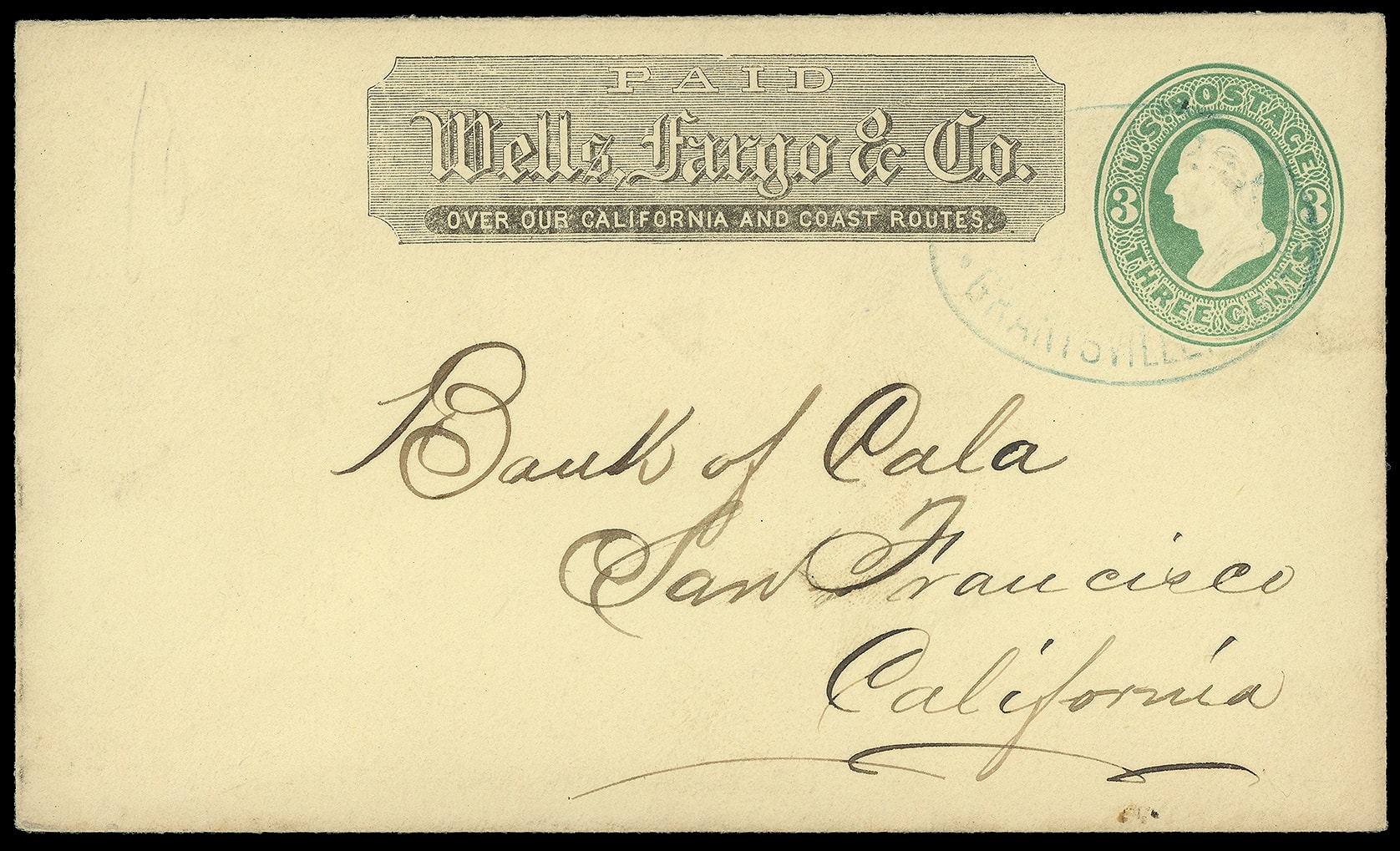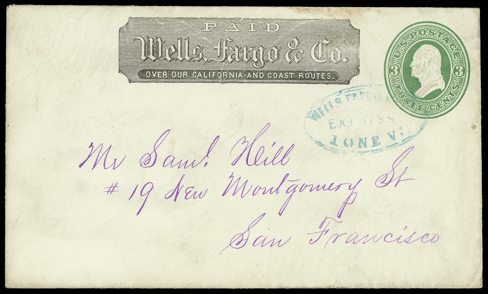 Express Ione Vy. Fine blue oval handstamp (Leutzinger 06-11) with printed Wells Fargo frank on 3¢ green (U82) entire to San Francisco Cal., Very Fine, fewer than five known from Ione Valley per the Thomas census.,