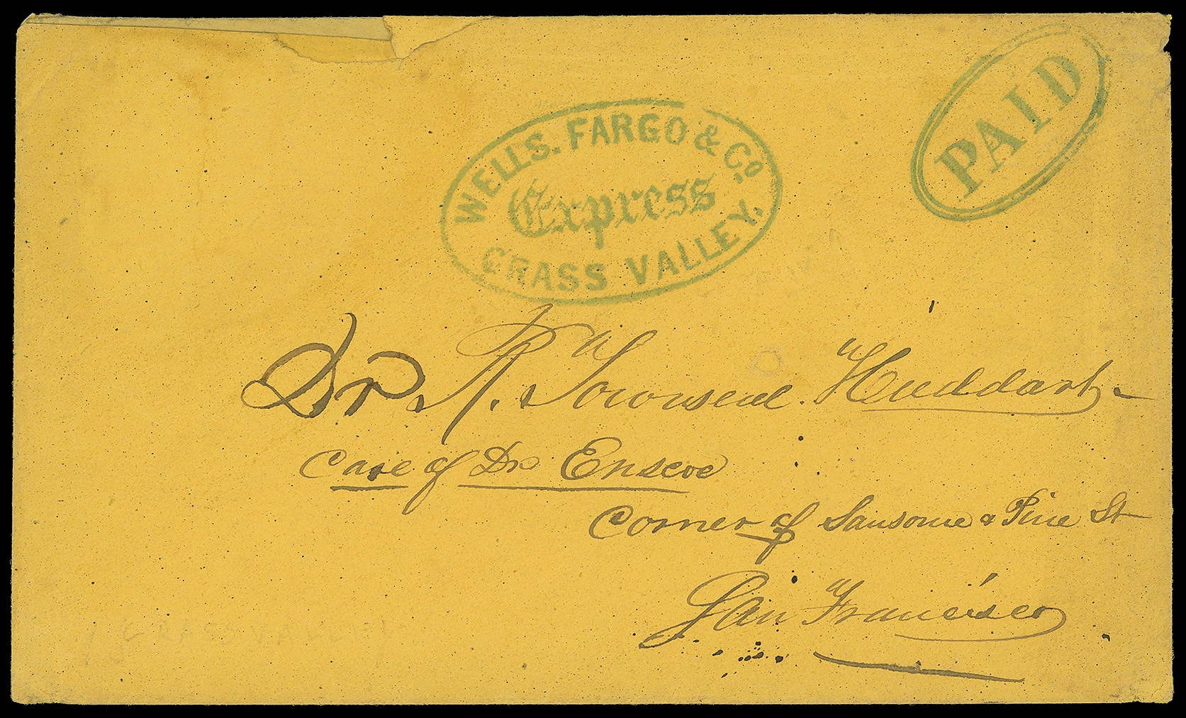 Express Grass Valley. Very Fine blue oval handstamp (Thomas WFE-101, Leutzinger 03-03) with matching "Paid" double-oval on yellow cover to San Francisco. Fewer than five recorded in the Thomas census. Opening tear at top margin, corner