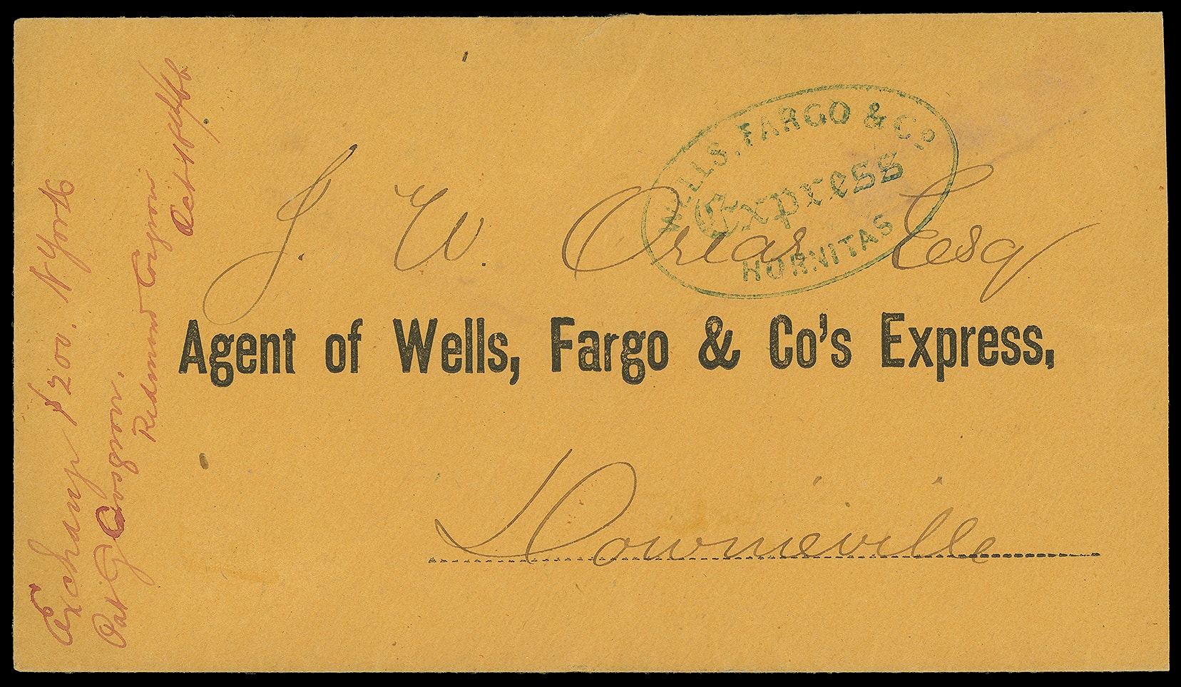 Express Hornitas. Blue oval (Leutzinger 03-01) on yellow-orange cover with printed address "Agent of Wells, Fargo & Co's Express" and "Downieville" written in manuscript as address beneath. Red docketing at left may read "Oct 18th/66", Very
