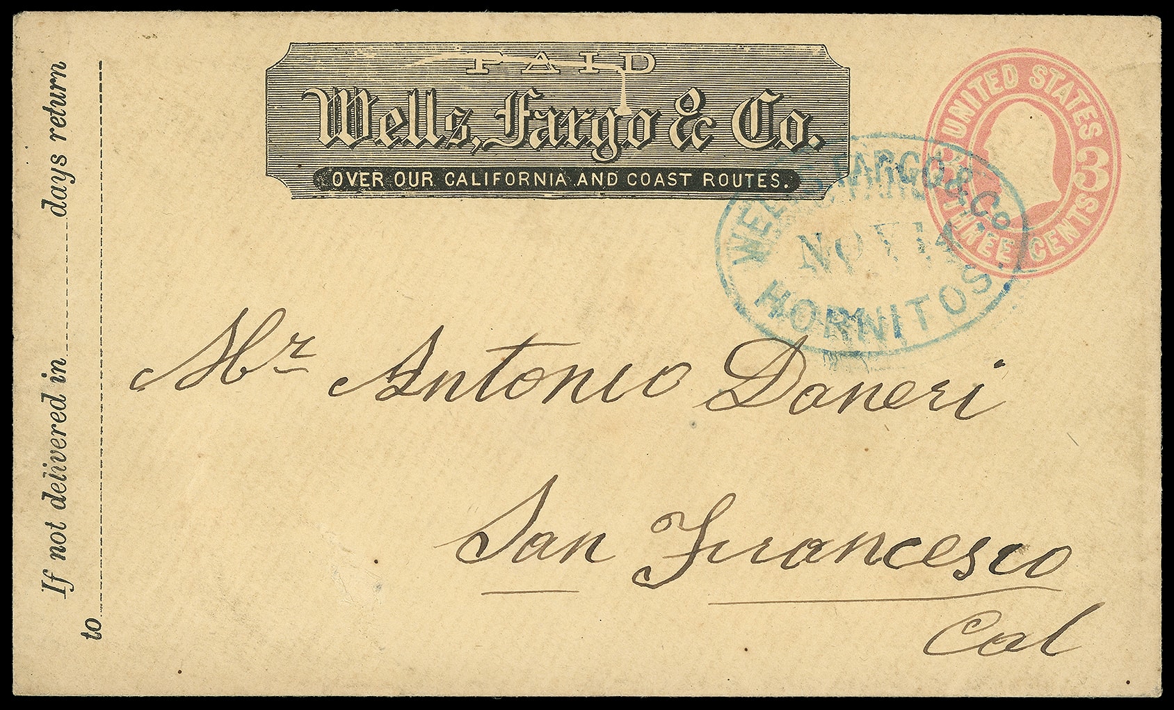 Hornitos Nov 14. Blue oval datestamp (Leutzinger 11-09) with printed Wells Fargo frank on 3¢ pink (U59) buff entire (U59) to San Francisco Cal., Very Fine, ex-Thomas, Blaine. Thomas No. WFE-105; Estimate $100 - 150. (Image1)