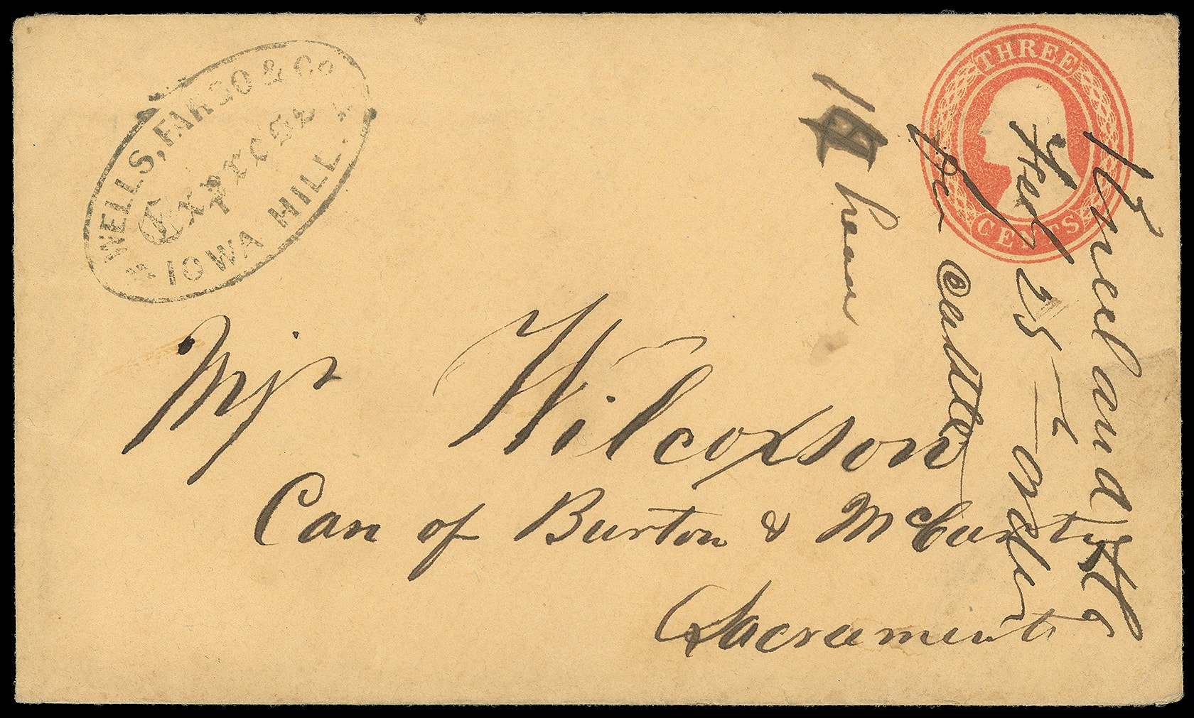 Express Iowa Hill. Black oval handstamp (Leutzinger 03-07) on 3¢ red (U10) Nesbitt buff entire with Nesbitt seal on backflap to Sacramento Cal.; docketing at right into indicium includes "for cattle, 14 head". "Five or fewer" examples