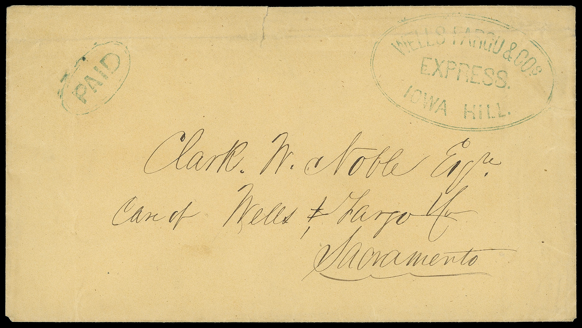 Express. Iowa Hill. Large blue oval handstamp (Leutzinger 03-01) with matching blue oval "PAID" on light buff cover to Sacramento Cal.; horizontal file fold through express handstamp, tear at top, F.-V.F., One of two examples