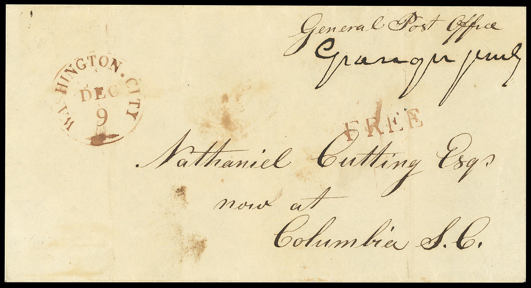 15       image(Postmaster General) Gideon Granger. 7th Postmaster General (1801-1814). 1806 folded cover with "Granger PMG" free frank endorsed "General Post Office" entering mails with "Washington. City, Dec 9" cds and "Free" rating handstamp to Columbia S.C., Very Fine.