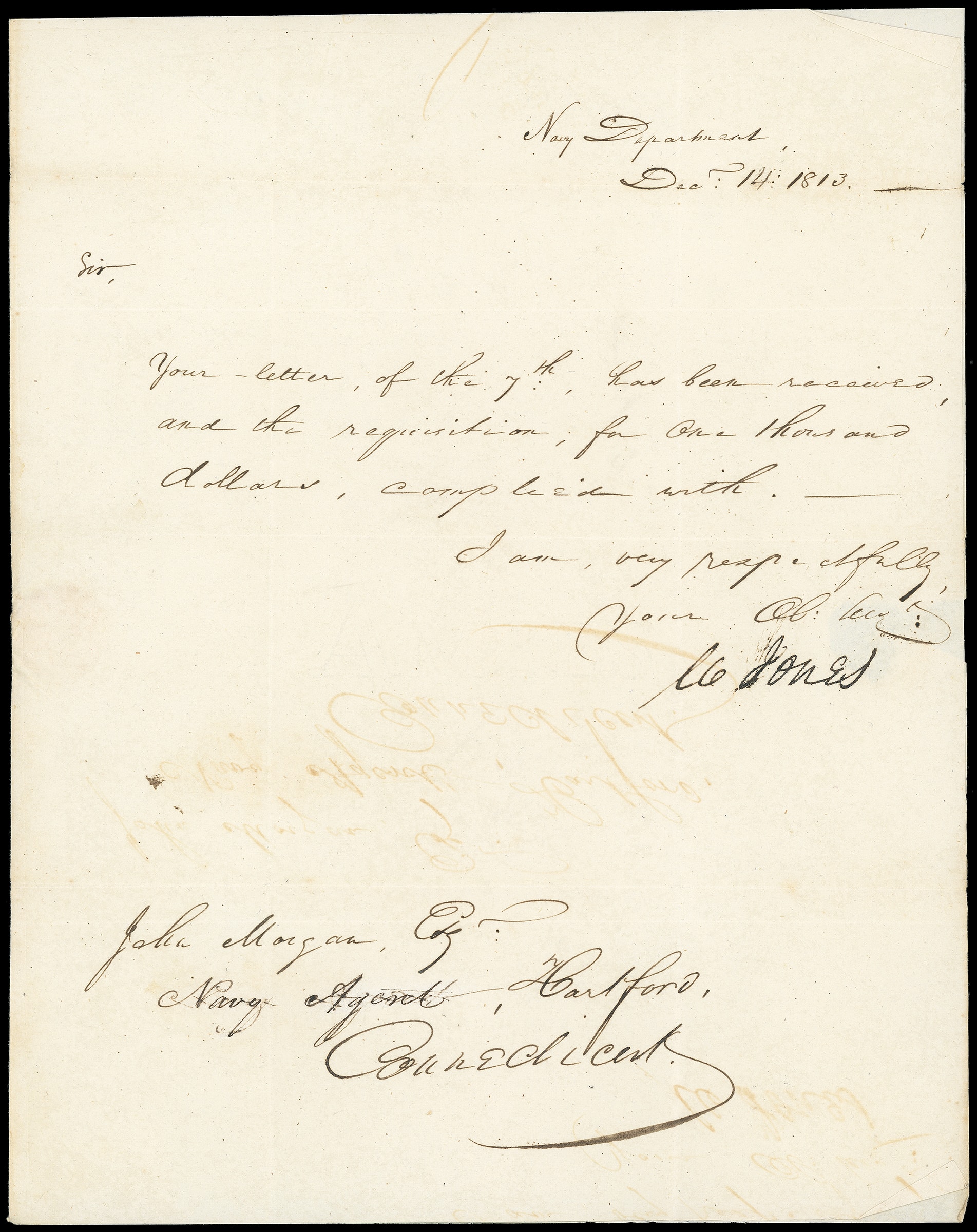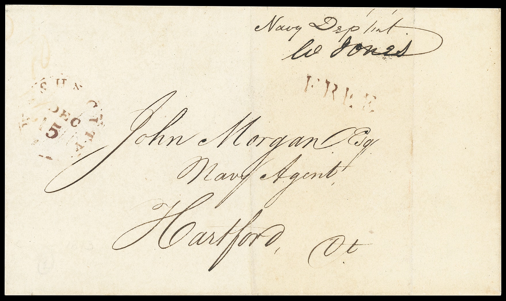 13       image(Secretary of the Navy) William Jones. Secretary of the Navy (Jan. 19, 1813 - Dec. 1, 1814). 1813 folded letter with "W Jones" free frank as Secretary of the Navy endorsed "Navy Deptmt" entering mails with "Wash. City, Dec 5" cds and "Free" rating handstamp to Hartford Ct., letter signed by Jones acknowledges $1,000 requisition from Navy agent, Very Fine and scarce Jones free franked as Sec. of the Navy.