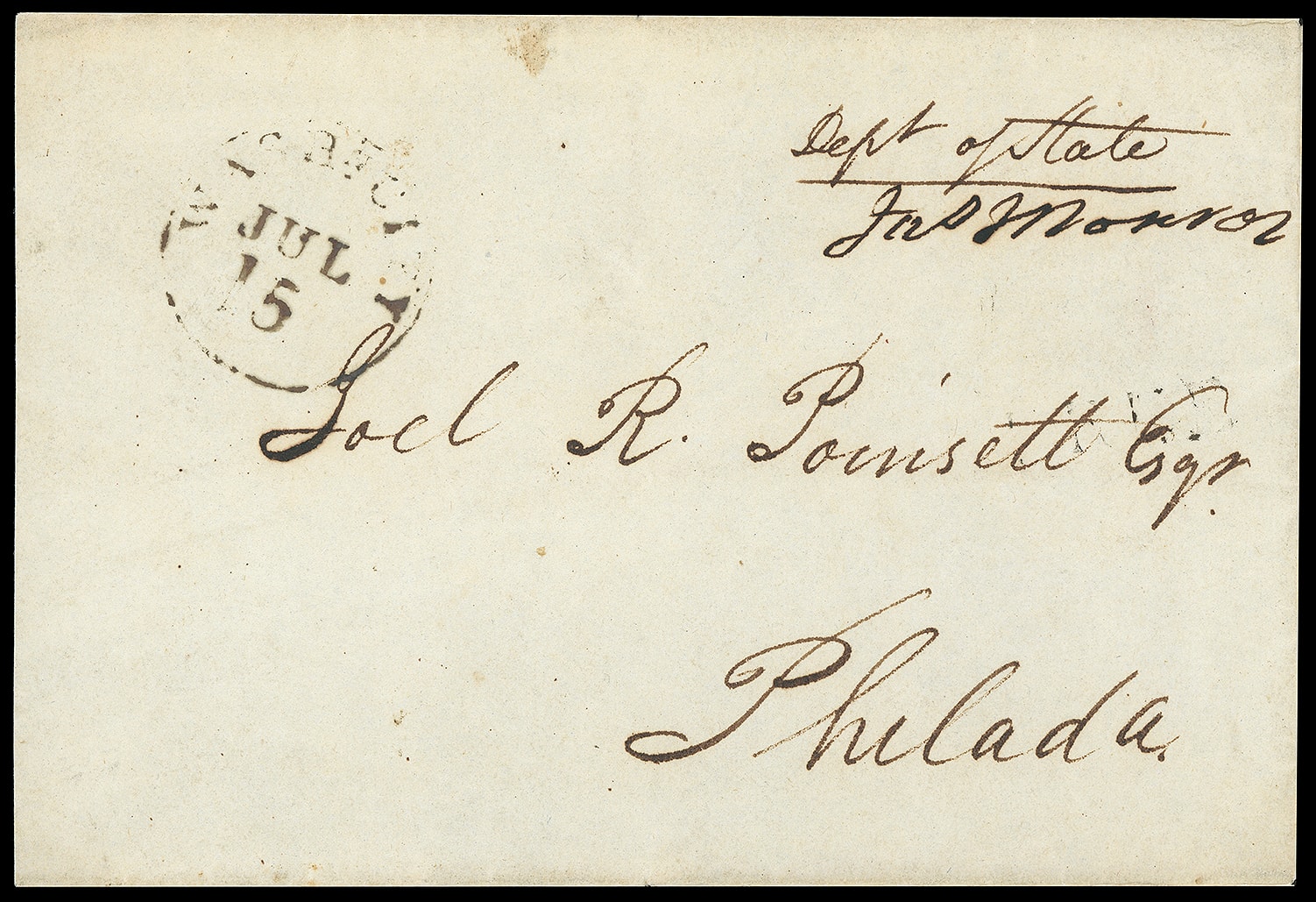 20       image(State) James Monroe. 7th Secretary of State 1811-1817. Free frank "Jas Monroe" as Secretary of State on circa 1816 folded cover endorsed "Dept of State", entered mails with "Washn. City Jul 15" cds and light "Free" rating handstamp to Joel R. Poinsett, Philadelphia Pa.; no left flap, Very Fine and choice, ex-Richard Graham.