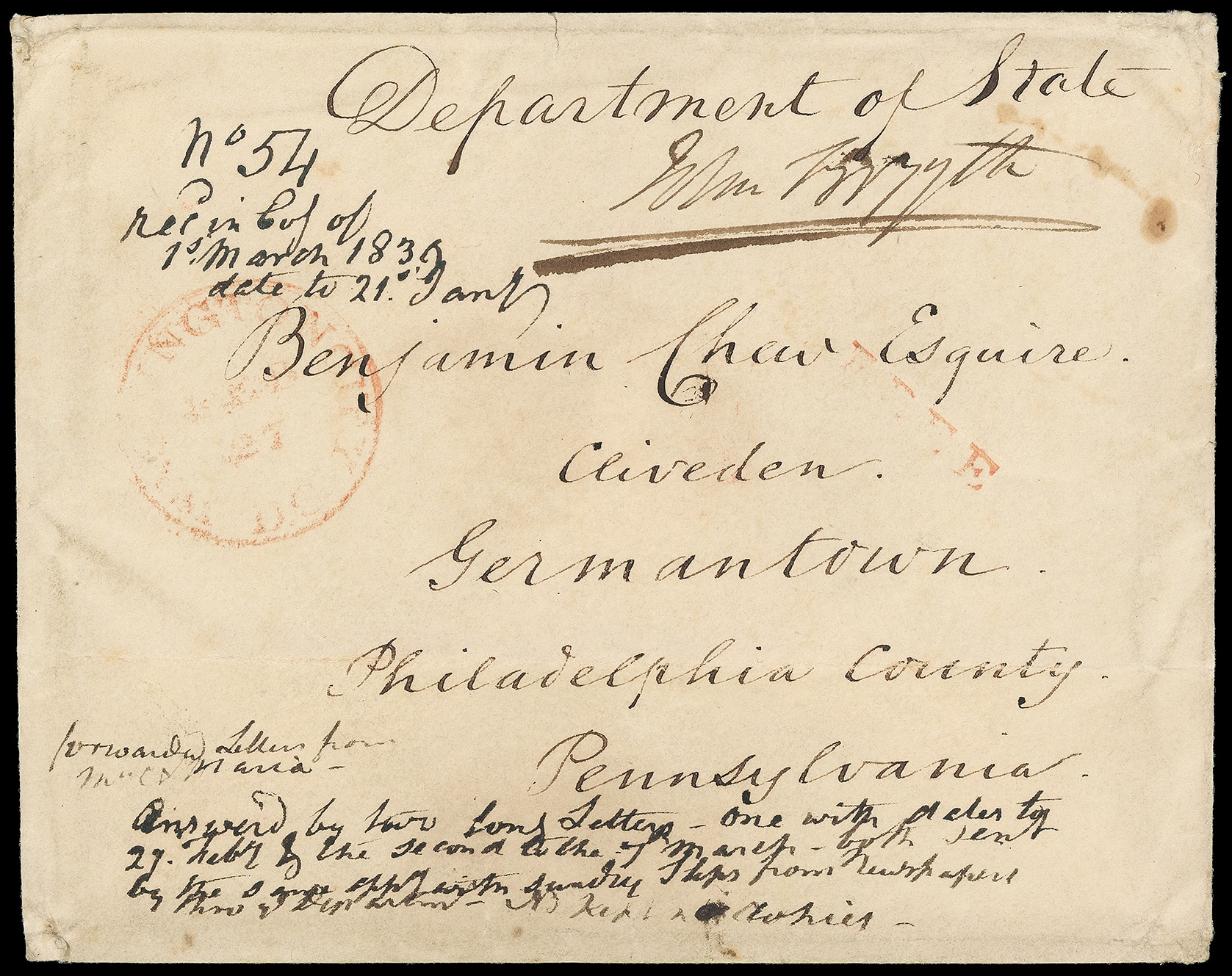19       image(State) John Forsyth. 13th Secretary of State 1834-1841. Cover sent by William W. Chew, U.S. Consul of St. Petersburg, Russia via diplomatic pouch to Washington D.C. where endorsed "Department of State" and free franked "Wm Forsyth" as Secretary of State, entered mails with red "Washington City, D.C., Mar. 27" cds and "Free" handstamp to Benjamin Chew, Germantown Pa., 1839 docketing; horizontal file fold, otherwise Very Fine and scarce.