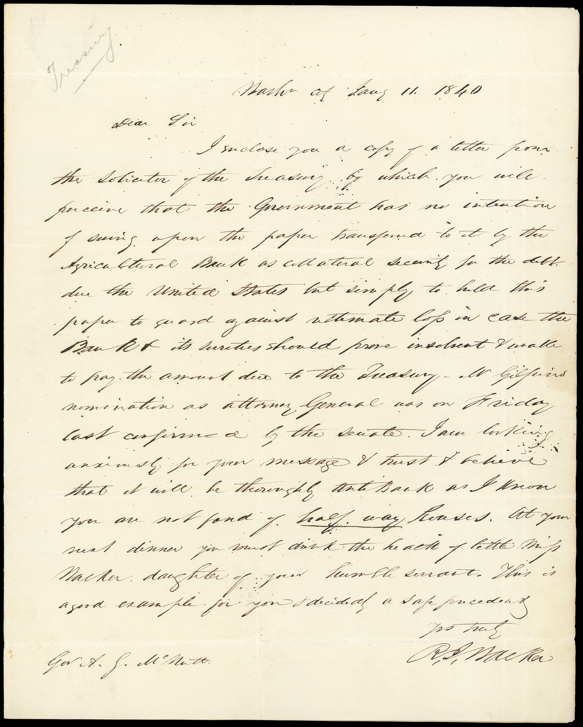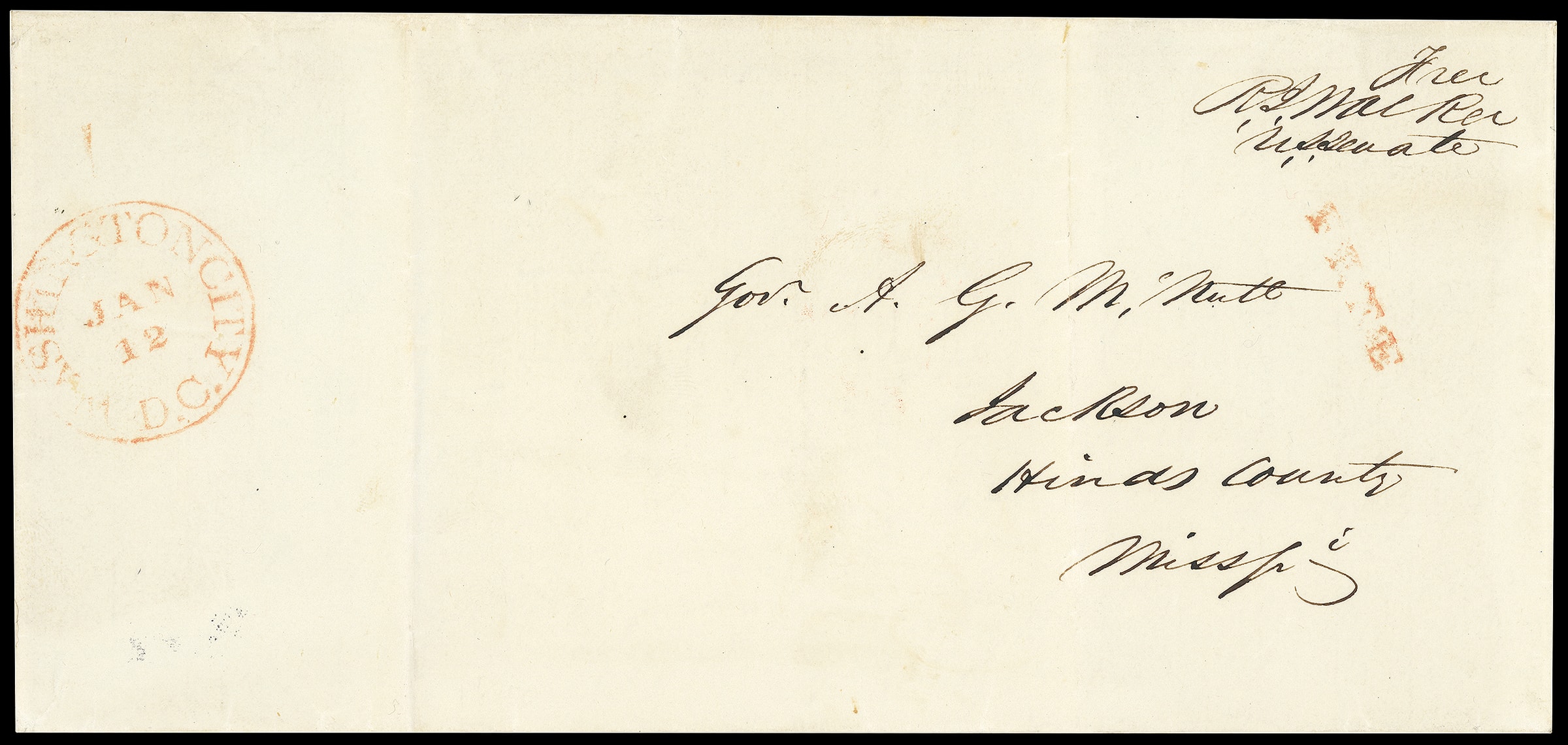 5       image(Senate) Robert James Walker. U.S. Senate 1835-1845, Secretary of the Treasury 1845-1849. 1840 folded ALS letter with "Free, R.J. Walker, U.S. Senate" free frank, entered mails with red "Washington D.C. Jan 12" cds and "Free" handstamp addressed to Governor A.G. McNutt, Jackson Miss., letter concerns the security collateral of Agriculture Bank against money due the United States, fresh and Very Fine.