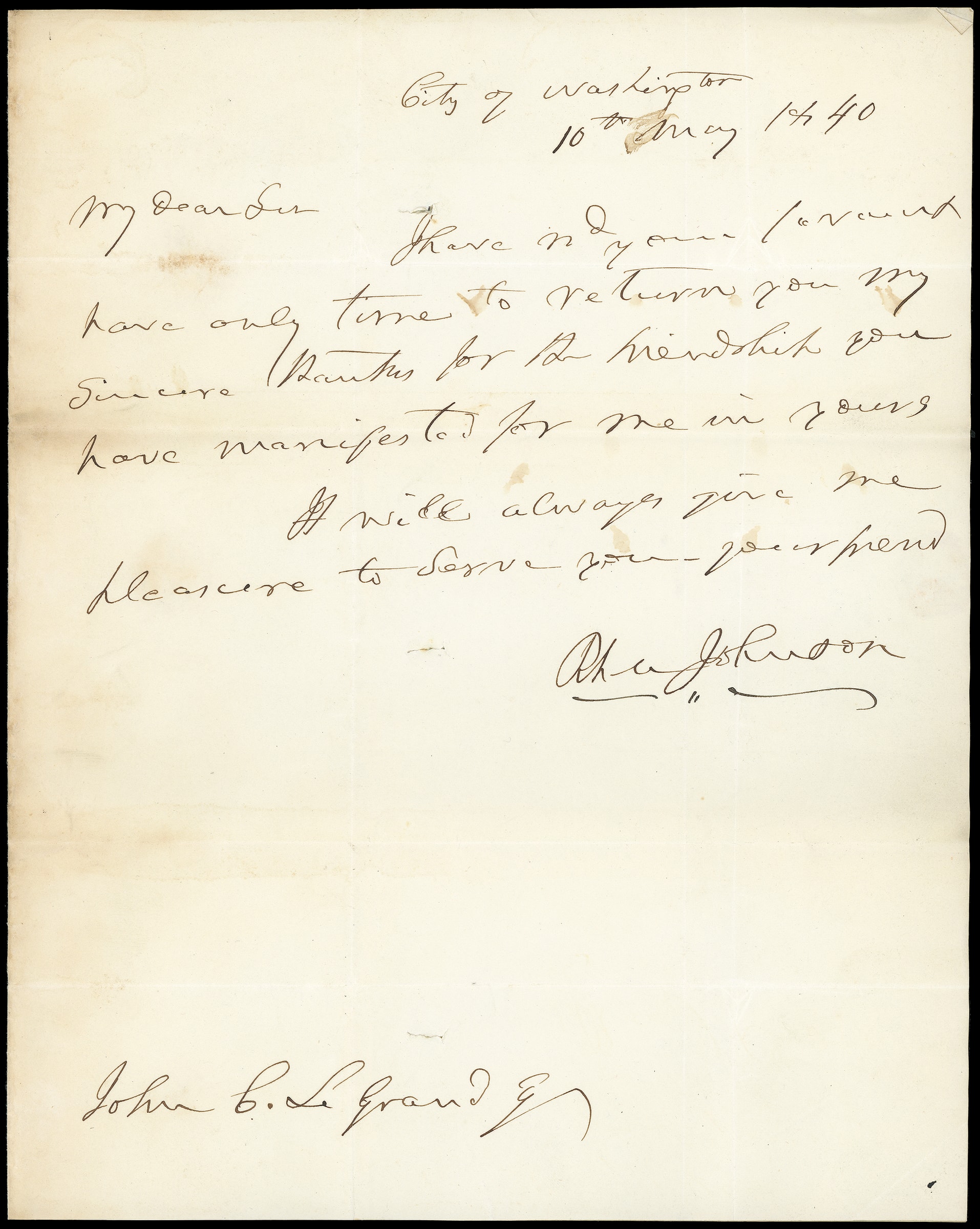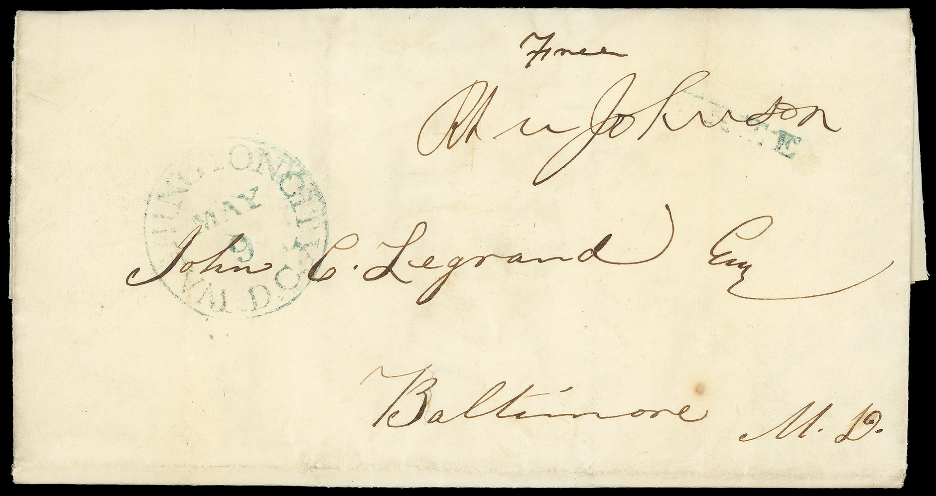 7       image(Executive) Richard Mentor Johnson. 9th Vice President of the United States 1837-1841. 1840 folded ALS letter with "Free, Rd W Johnson" free frank, entered mails with blue "Washington City D.C. May 9" cds with matching "Free" handstamp to John C. LeGrand, Baltimore Md., letter sends sincere thanks for friendship and pleasure to serve his friend; small internal tear, Very Fine.