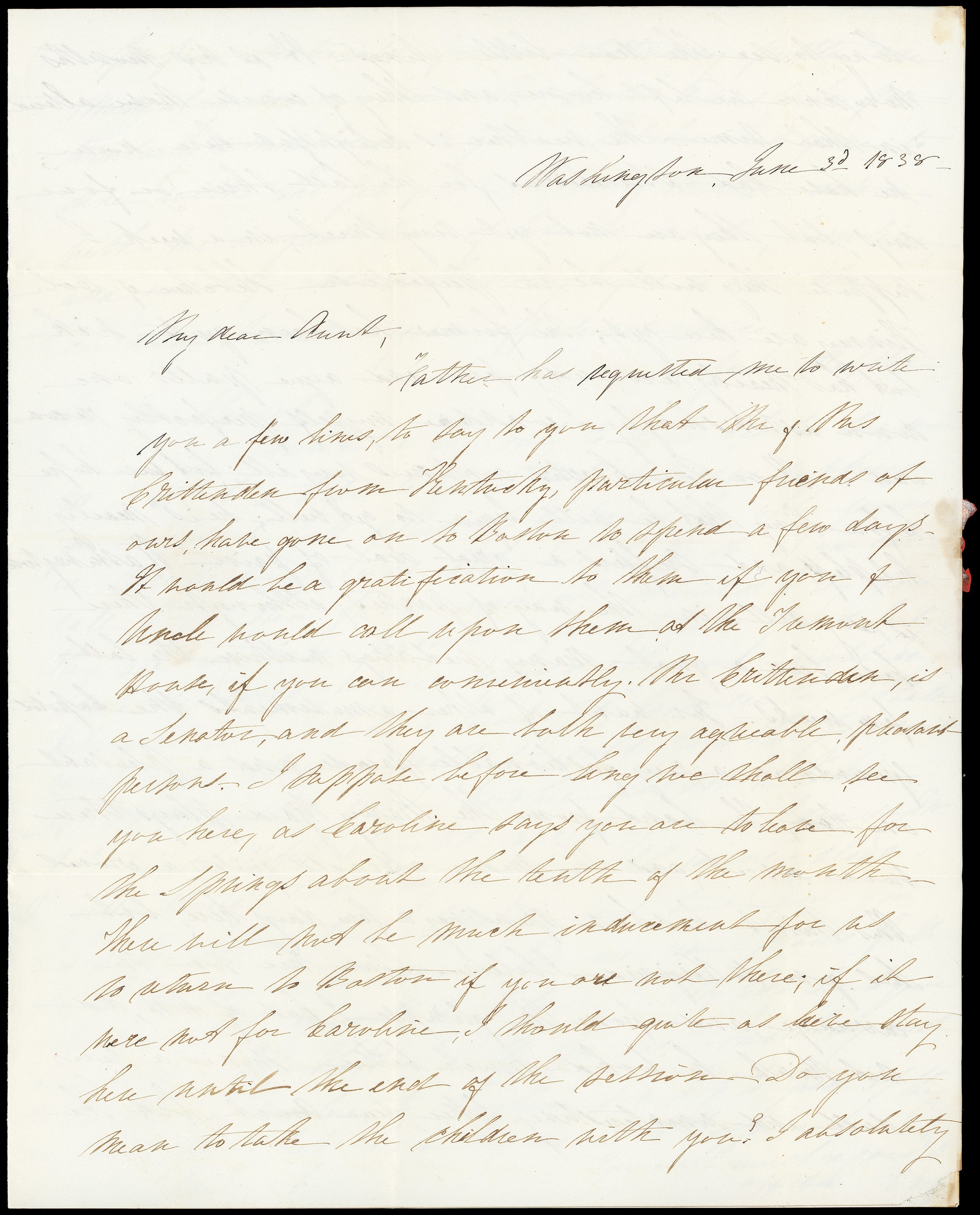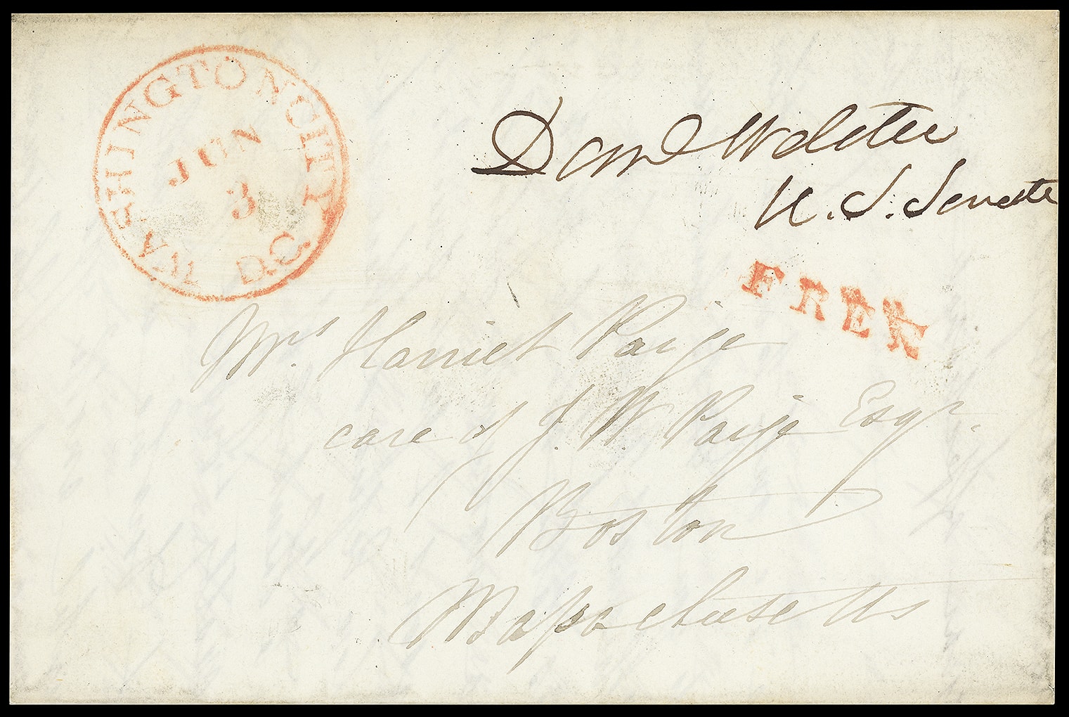 6       image(Senate) Daniel Webster. 1838 folded ALS letter with "Danl Webster, U.S. Senate" free frank, entered mails with red "Washington D.C., Jun 3" cds and "Free" handstamp to Boston Mass., letter is family correspondence, Very Fine.