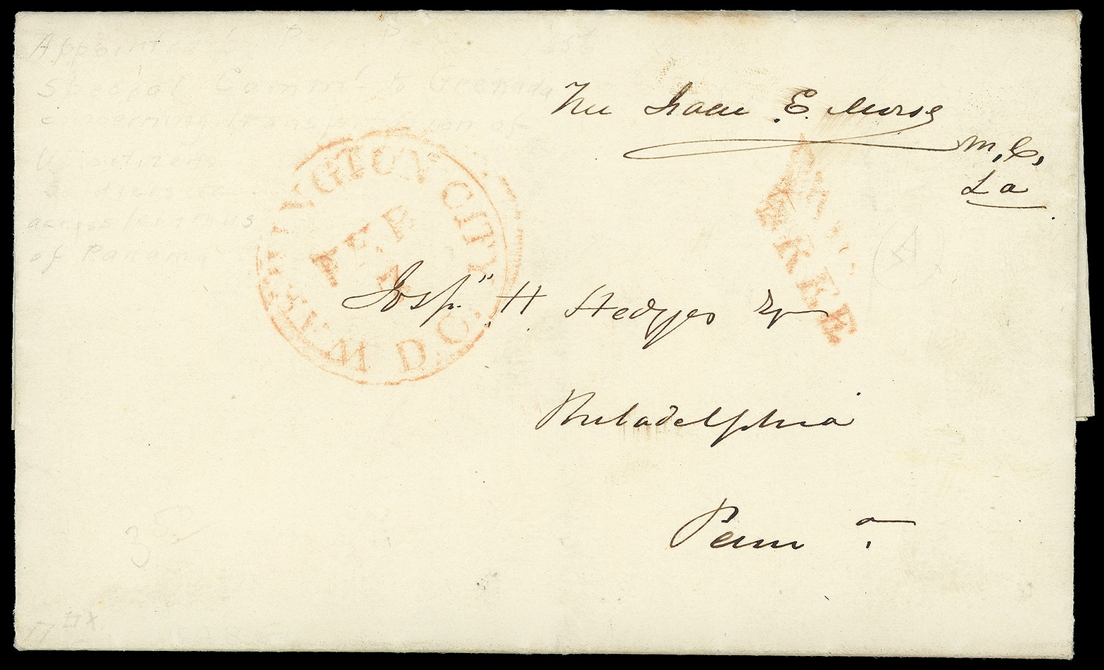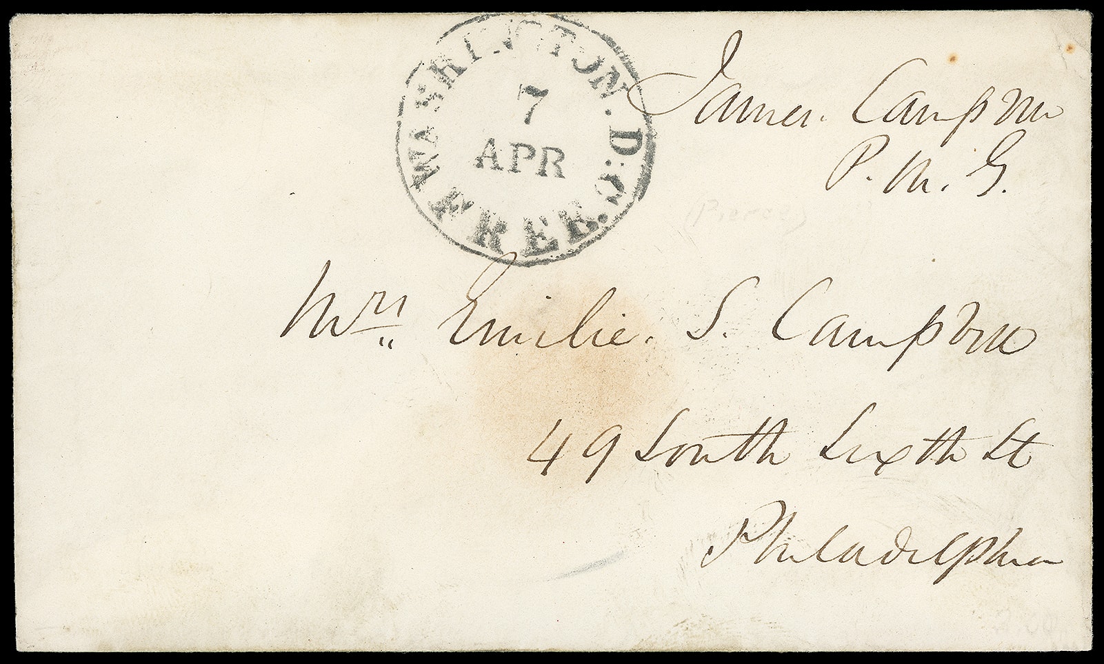 14       image(Postmaster General) James Campbell. Postmaster General 1853-57. Neat "James Campbell, P.N.G." free frank, entered mails with "Washington D.C., Free, 7 Apr" integral cds to his wife in Philadelphia Pa.; light wax seal stain, otherwise Very Fine.