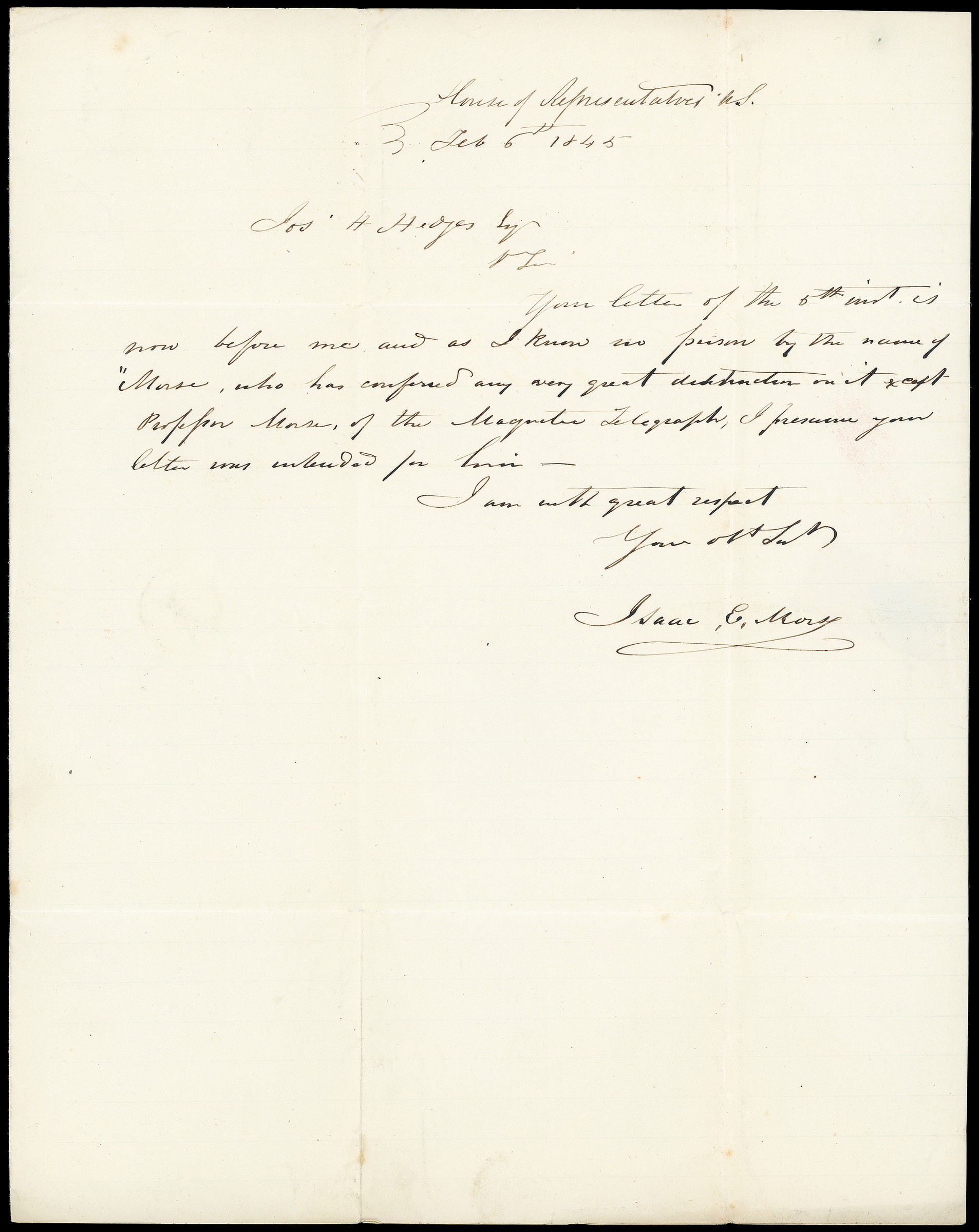 3       image(Congress) Isaac E. Morse. 1845 ALS folded letter with ms. "Free, Isaac E. Morese, M.C., La" free frank, entered mails with red "Washington D.C., Feb 7" cds and "Free" straightline to Philadelphia Pa., letter mentions addressee's letter must have been seeking "Professor Morse of the Magnetic Telegraph" that refers to the famous Inventor of the Telegraph, fresh and Extremely Fine.