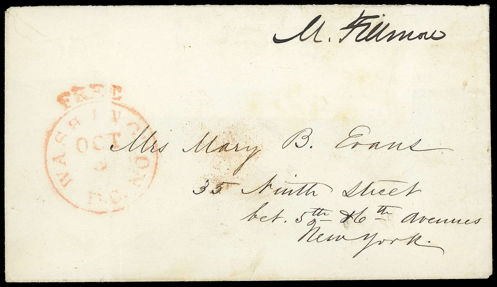 8       image(Executive) Millard Fillmore. 13th President 1850-53. Bold free frank "M. Fillmore" signature as President entered mails with red "Washington D.C., Free, Oct 3" attached-rate cds on circa 1850 cover to New York City; internal cut and corner tear, flap missing, otherwise fresh and Very Fine.