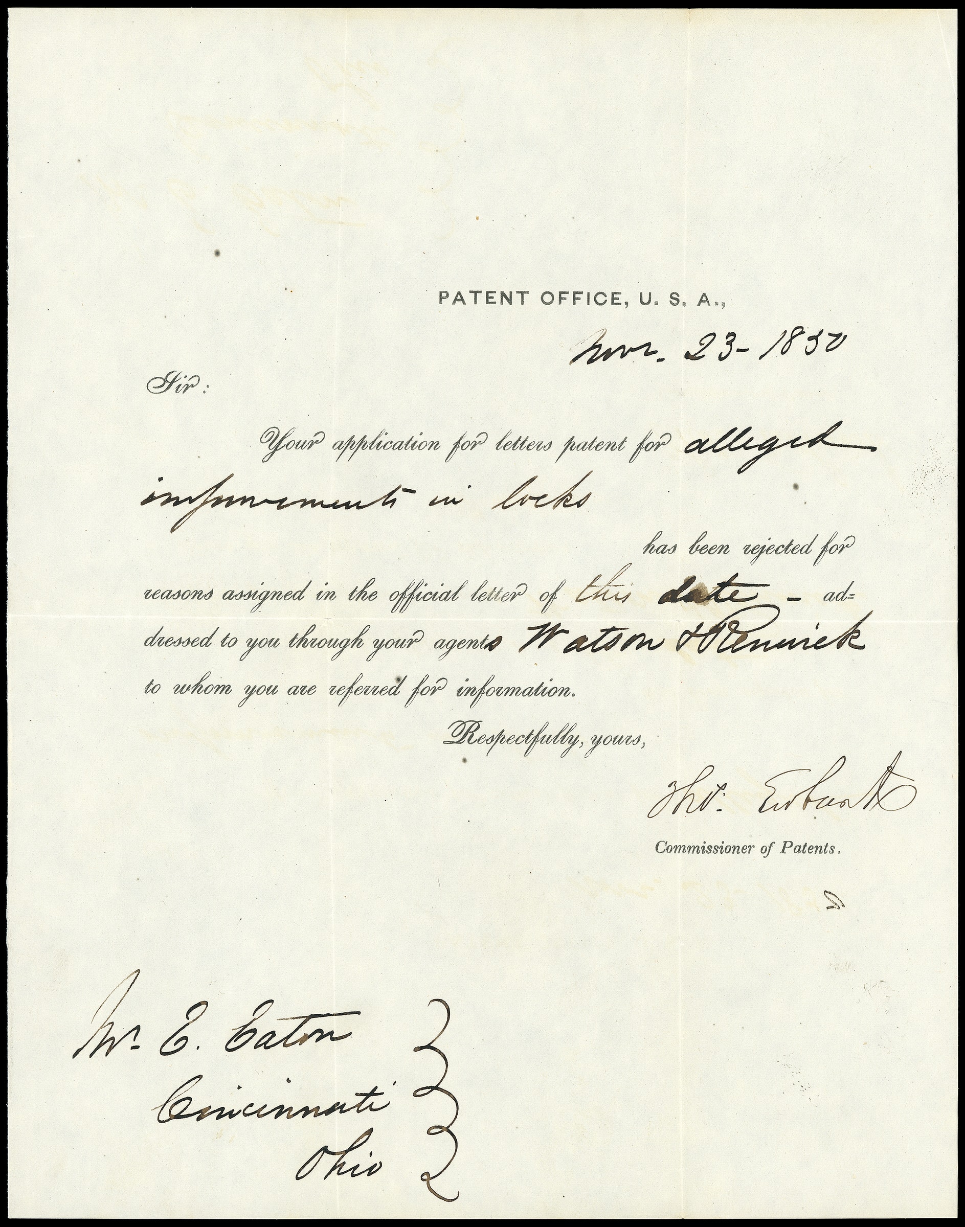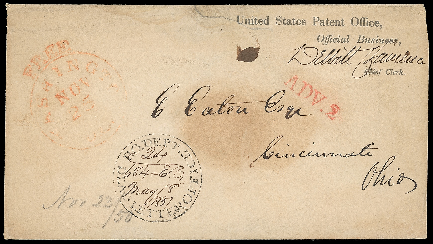 11       image(Interior) Dewitt C. Laurence, Chief Clerk of Patent Office 1849-50. Free frank "Dewitt C. Laurence" signature on 1850 U.S. Patent Office imprint envelope to Cincinnati Oh., red "Washington D.C. Nov 25" cds with attached "Free" rating, original 1850 enclosure rejecting patent claim, pencil "Opened by Mistake, E. Eaiton" on reverse, Cincinnati red "ADV. 2" advertised due rating handstamp, sent to DLO with "P.O. Dept. Dead Letter Office" circular handstamp with ms. "May/ 8 1851" dating; red Patent Office wax seal; cover tear and light wax seal stain, reduced slightly at right, F.-V.F., ex-Graham.