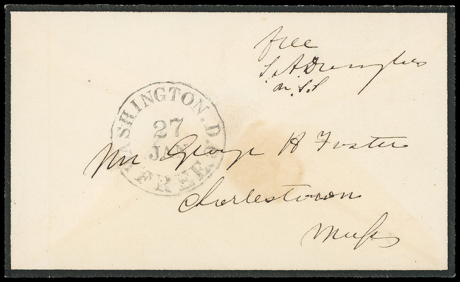 4       image(Senate) Stephen A. Douglas. Free frank "Free, S.A. Douglas, U.S.S." signature, entered mails with "Washington D.C., Free, 27 Jan" integral cds on circa 1853 mourning cover to George H. Foster at Charleston Mass.; faint wax seal stain, Very Fine.