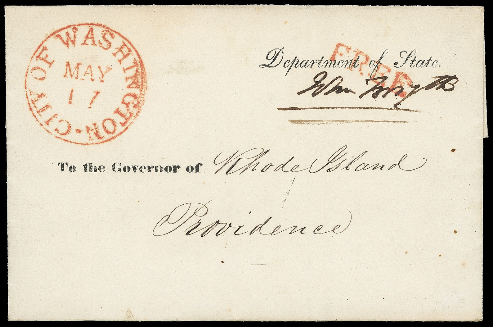 18       image(State) John Forsyth. 13th Secretary of State 1834-1841. Bold free frank "John Forsyth" signature, entered mails with bold red "City of Washington, May 17" cds and "Free" straightline on Department of State imprint folded cover addressed to the Governor of Rhode Island, an Extremely Fine gem.