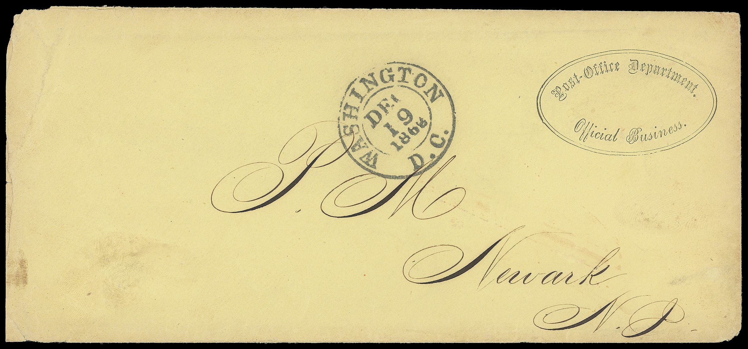 16       image(Post Office) Alexander N. Zevely. Third Assitant Postmaster General 1859-1869. ALS letter signed "A.N. Zevely, Third Asst. P.M. Genl" on Dec. 19, 1862 illustrated Post Office Department letterhead with building vignette to David Price, Postmaster of Newark N.J., regarding having been directed by the Secretary of the Treasury to furnish him with $1000 in postage currency for a like sum in U.S. notes, "The amount of postage currency thus obtained, is to be used for change in the redemption of postage stamps and in the legimitate business of your office.", accompanied by yellow "Post Office Department, Office Business" oval imprint envelope with bold "Washington D.C. Dec 19, 1862" cds to the Postmaster, Newark N.J.; reduced at left, Very Fine and interesting letter in the study of postage currency during the Civil War when there was a shortage of coins for change.