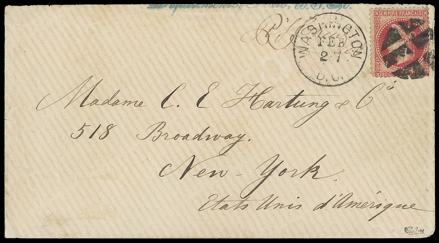 17       image(State) Robert S. Chew. State Department Chief Clerk 1855-73. Free frank "R.S. Chew, C.C." chief clerk signature and partial blue "Department of State, U.S.A." straightline at top edge of incoming cover bearing France, 1867, Napoleon III Laureate, 80c rose on pinkish (36) tied by six-section grid cancel duplexed with "Washington D.C. Feb 27" cds to Hartung & Co., New York N.Y., Very Fine and early diplomatic pouch use.