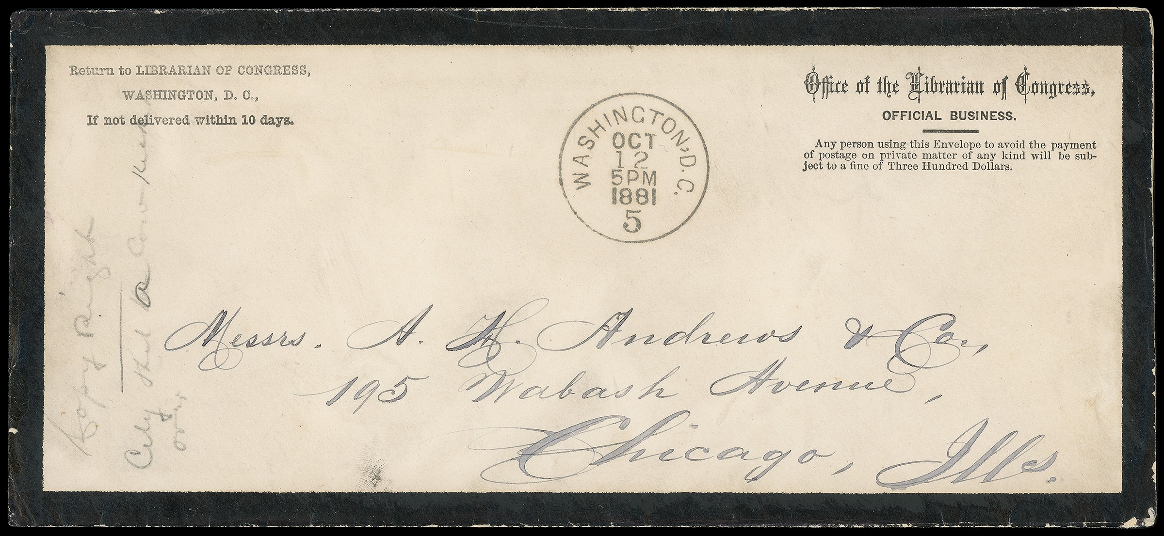 12       image(Interior) Office of the Librarian Congress. Penalty imprint on mourning cover with sharp "Washington, D.C. '5' Oct 12, 1881" cds to Chicago Ill.; some edgewear, Very Fine and scarce Garfield mourning use.