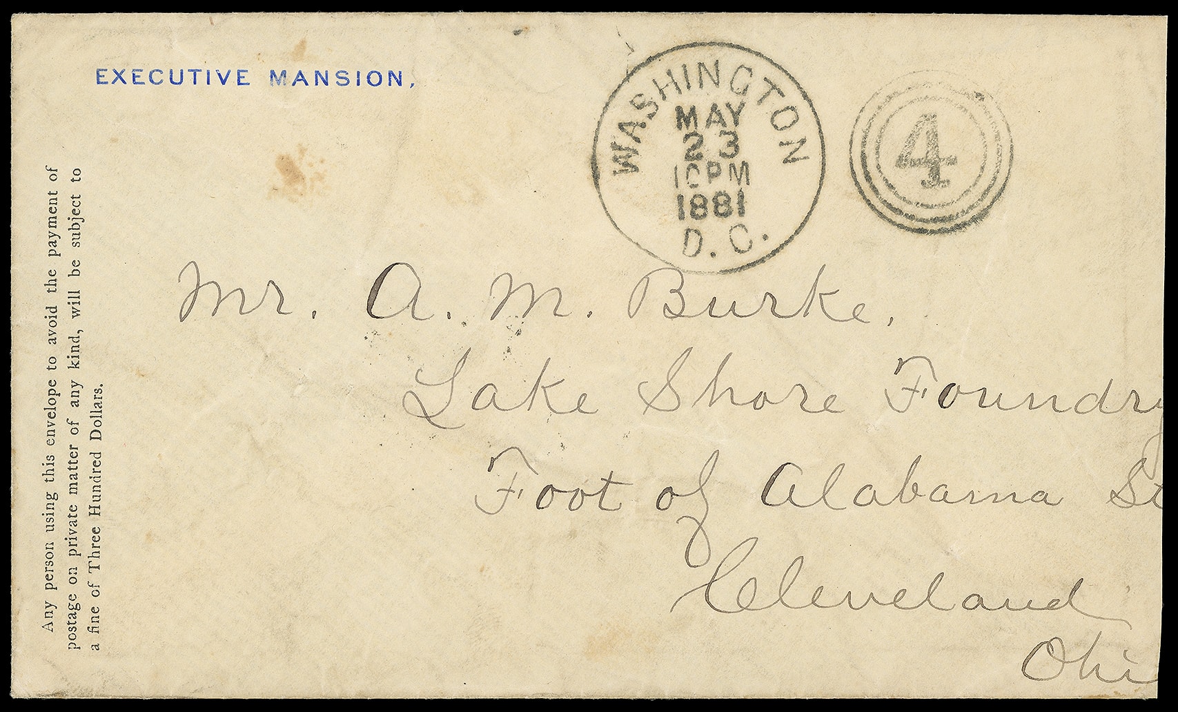 10       image(Executive) Executive Mansion. Blue imprint cover with penalty imprint at left, entered mails with bold "Washington D.C. May 23, 1881" duplex with "4" in three-rings cancel to Cleveland Oh.; reduced at right, wrinkling, Fine and rare use during the Garfield administration.