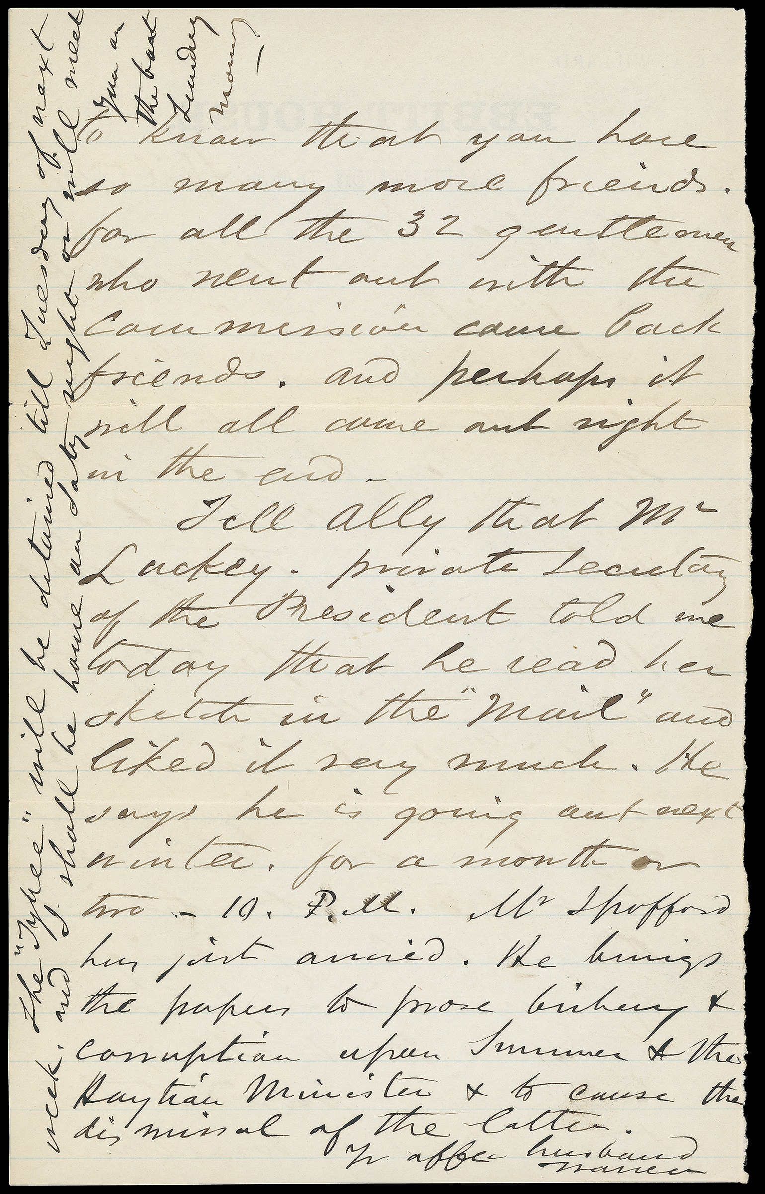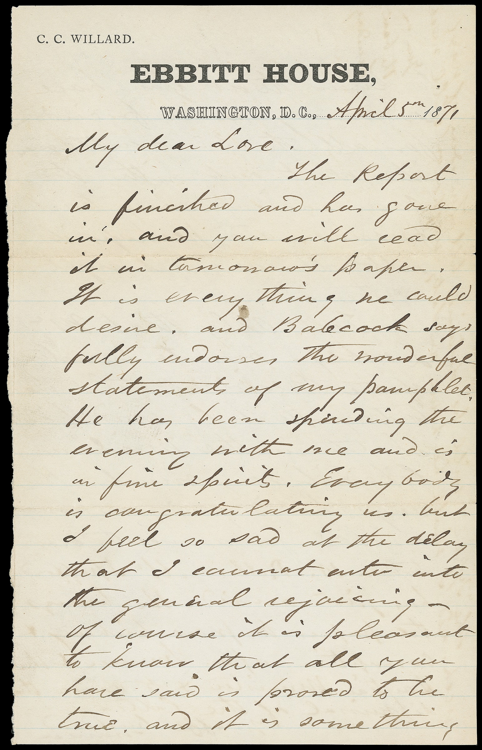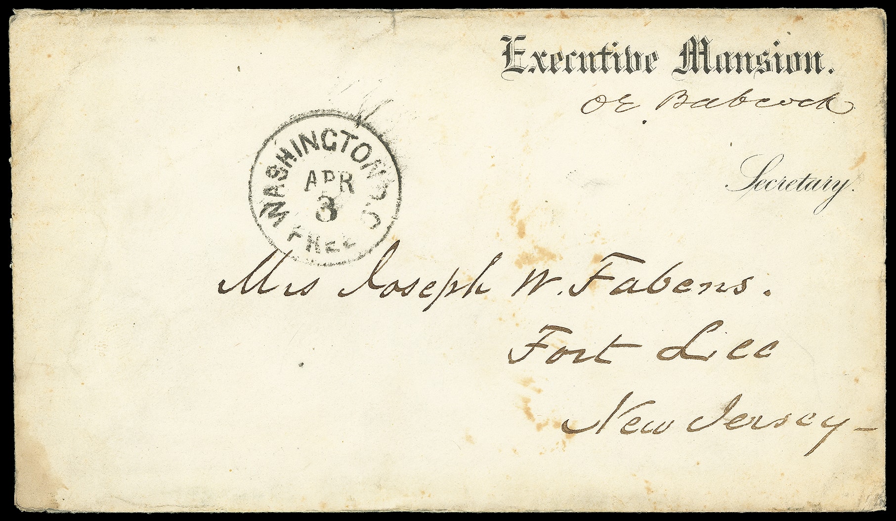 9       image(Executive) Orville E. Babcock. Presidential Secretary 1869-1877. Free frank "O.E. Babcock" as Presidential Secretary on Executive Mansion imprint cover with "Washington D.C., Free, Apr 8" cds to Fort Lee N.J.; original Ebbitt House lettersheet datelined April 5th 1871 from Joseph W. Fabens, Ambassador to Nicaragua to his wife; some cover wear and soiling, F.-V.F.