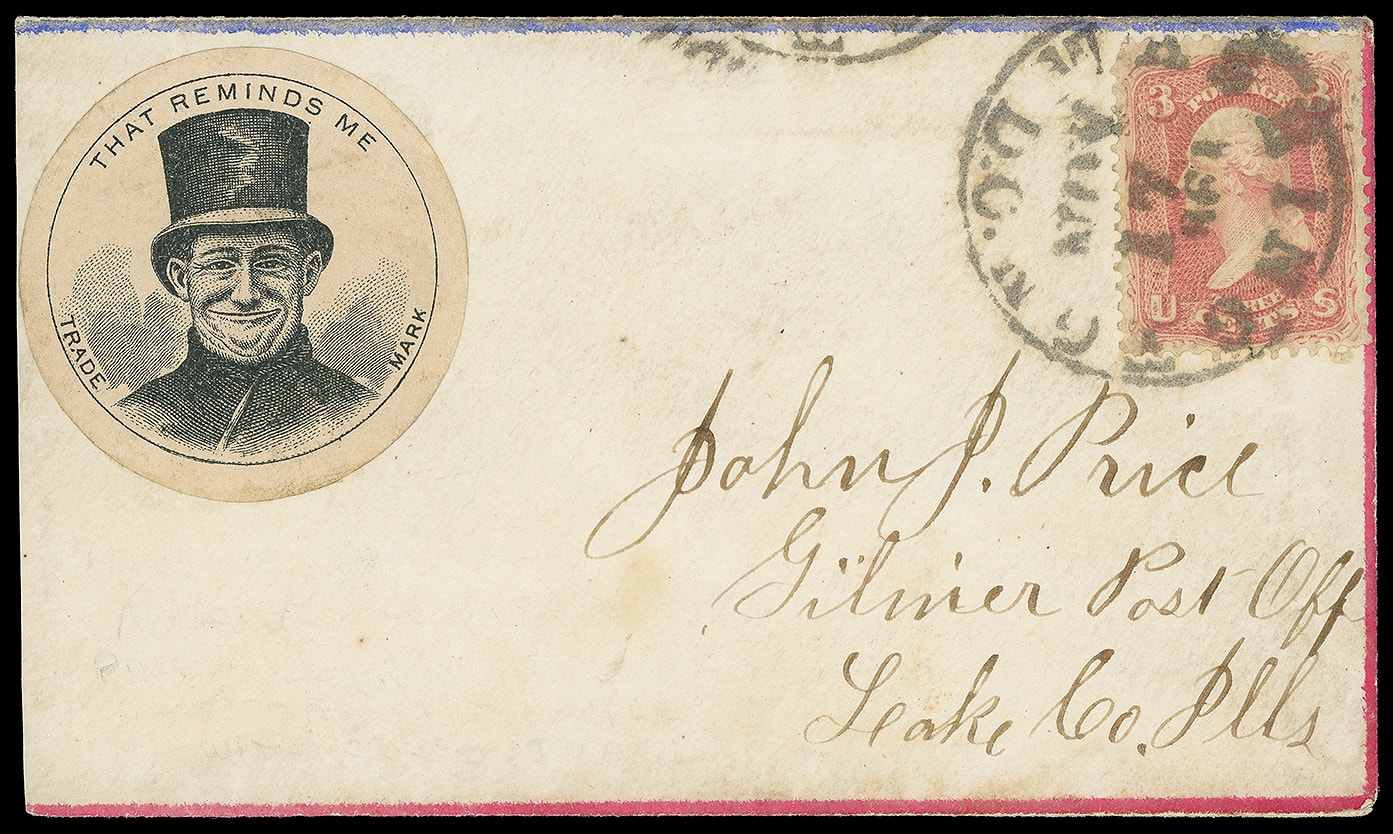 221       image"That Reminds Me". Advertising sticker on red and blue edged patriotic cover bearing 3¢ rose (65) tied by "Washington D.C. Nov 17, 1861" cds to Gilmer Ill.; reduced at left, F.-V.F. and unusual.