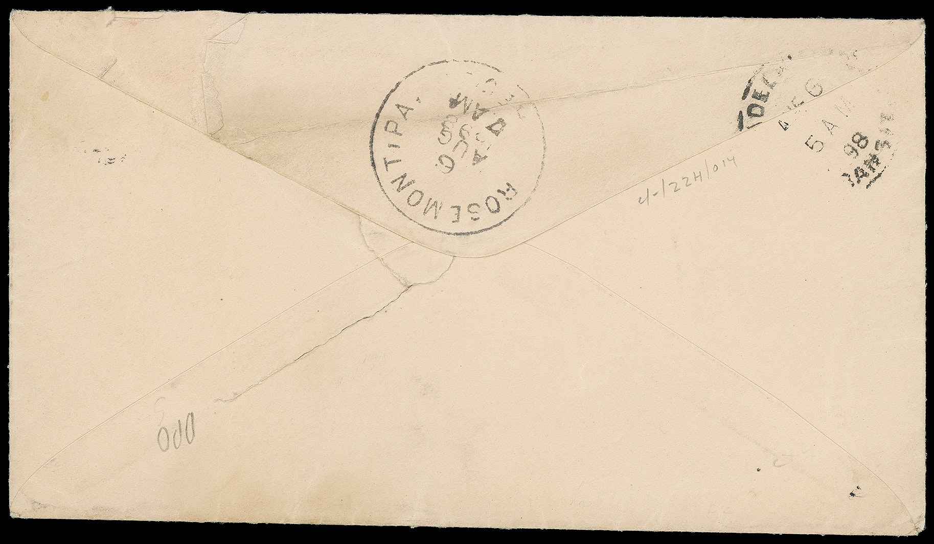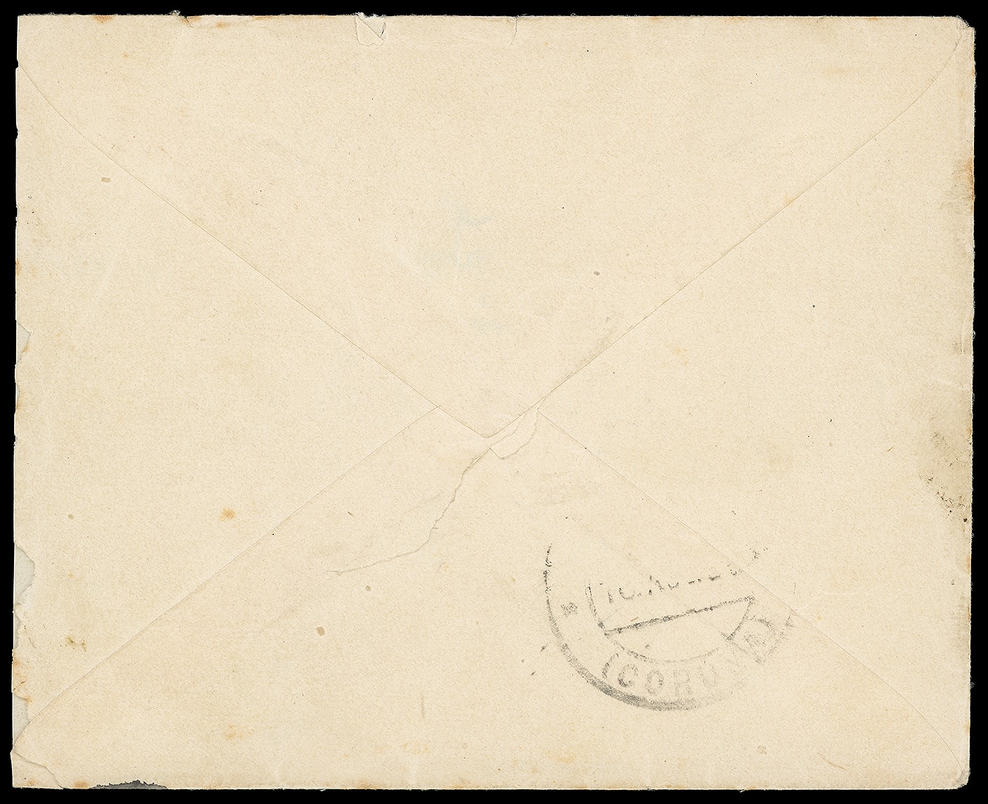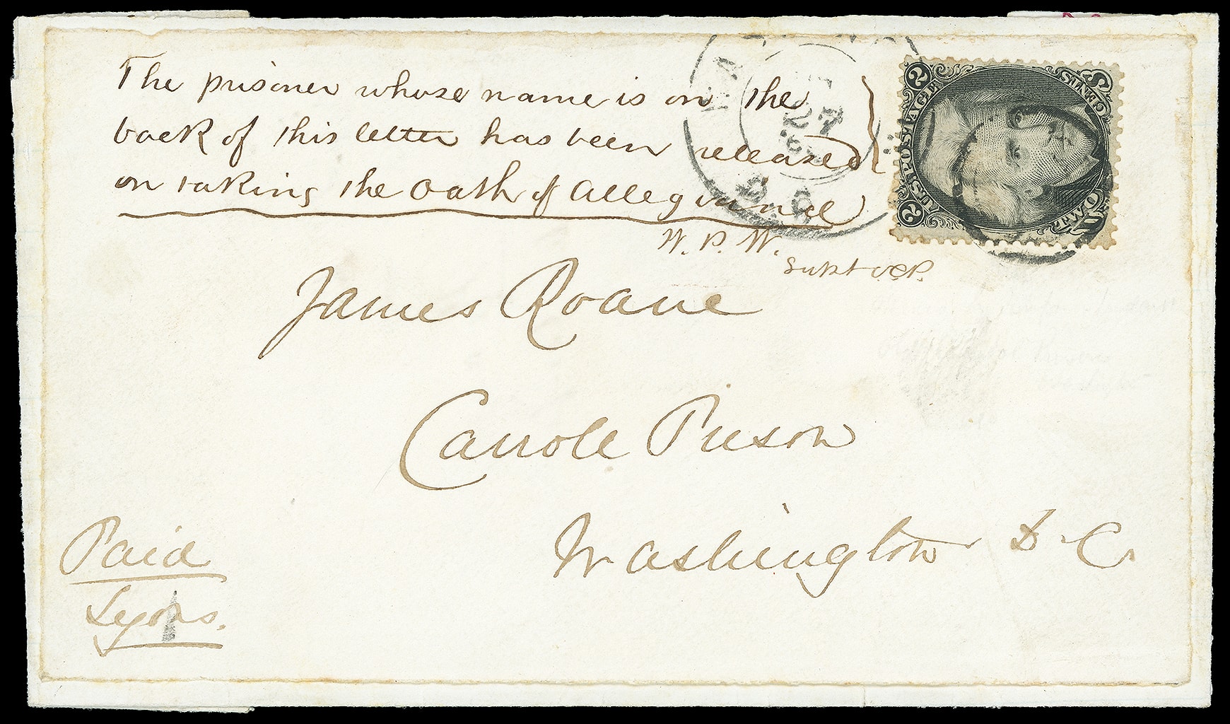222       imageCarroll Prison. Cover front bearing 2¢ black (73) tied by "Washington D.C., Dec 27 '63" cds duplex to Prisoner of War James Roane, Carroll Prison, Washington D.C. endorsed "Paid Lyons" at lower left, endorsed "The prisoner whose name is on the back of this letter has been released on taking the oath of allegiance, W.P.W., Supt. C.P.", front pasted on folded sheet with "1863, Washington Decr. 28. Major Turner to Lord Lyons, Recd Decr 29", Very Fine and unusual prisoner of war use, ex-Rorke, with 1978 P.F. certificate.