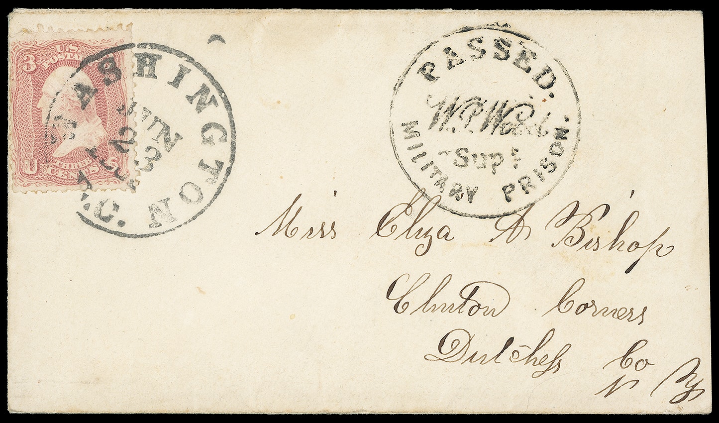 223       imageOld Capital Prison, Washington, D.C. Prisoner cover bearing 3¢ rose (65) tied by "Washington, D.C., Jun 23, 1863" cds, neat strike of "Passed, Military Prison, W.P. Wood Supt." circular examiner's handstamp; reduced slightly at right, 3¢ couple perf flaws, Very Fine.