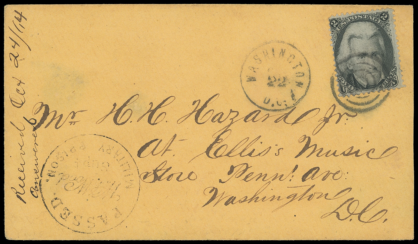 224       imageOld Capitol Prison, Washington D.C. Mostly clear strike of "Passed W. P. Wood Supt. Military Prison" examiner's circular handstamp on orange prisoner-of-war drop cover bearing 2¢ black (73), tied by four-ring cancel duplexed with "Washington D.C. Oct 22" cds, 1864 docketing at left, barely reduced at right, Very Fine, ex-Faust, Flannery.
