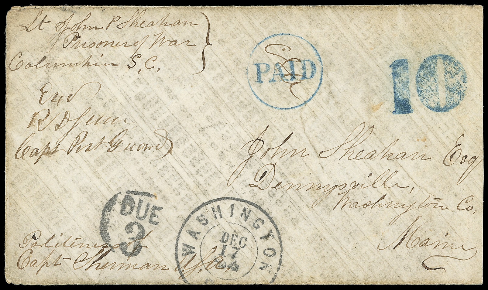 225       imageRichland Jail, Columbia S.C. Adversity cover made from a printed math table with strikes of Columbia S.C. Provisional "Paid" in circle and "10" handstamps, sent by prisoner-of-war to Dennysville Me., endorsed "Lt. John P Sheahan, Prisoner of War, Columbia S.C.", manuscript censor mark "Exd RD Senn, Capt Post Guard", carried out of the prison by an exchanged prisoner with "Politeness of Capt Sherman U.S.A." endorsement, "Washington D.C. Dec. 17 '64" double-circle datestamp and "Due 3" handstamp, provisional "PAID" in circle handstamp overwritten with "C.S.A." by U.S. postal clerk, some edgewear and backflap partially split, Very Fine, ex-Walske.