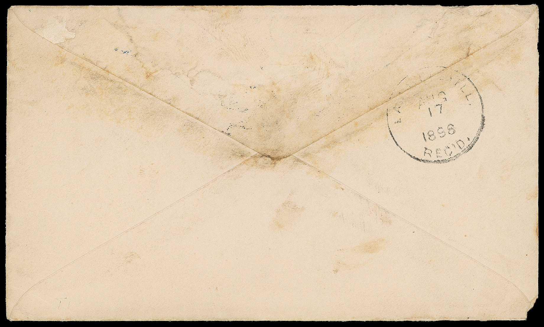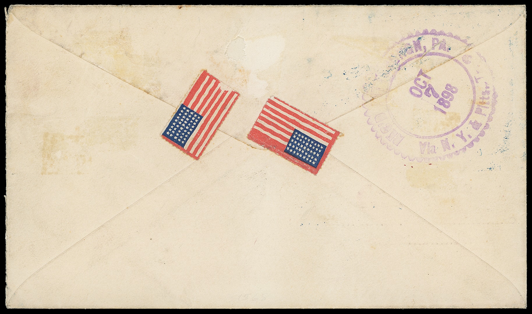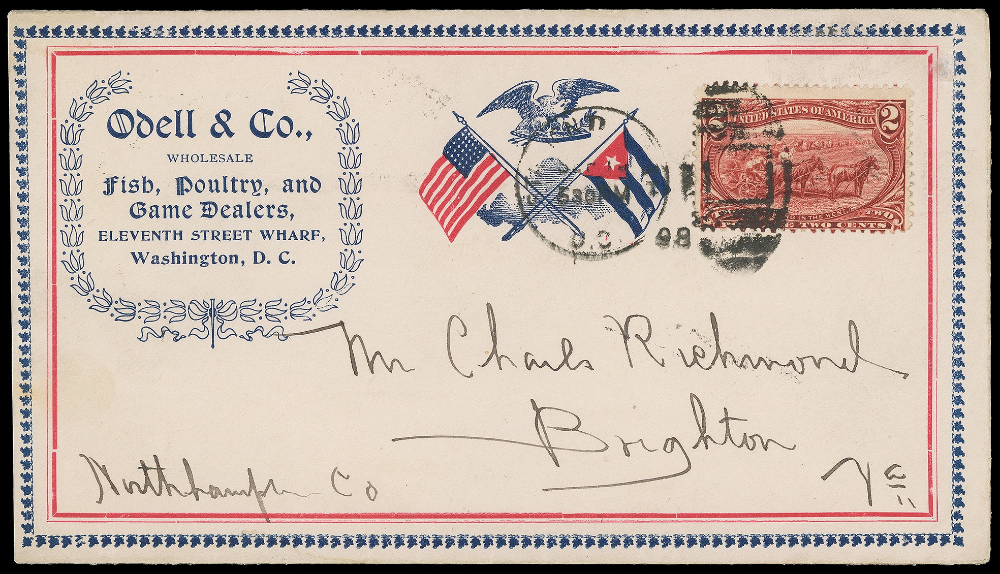 229       imageEagle with Crossed American and Cuban Flags. Fancy red and blue bordered patriotic design of Odell & Co., Fish, Poultry and Game Dealers of Washington D.C., bearing 2¢ Trans-Mississippi (286) tied by partial "Washington D.C. Station D, Sep 10 '98" duplex to Brighton Va., reverse with Washington D.C. (9.10) machine transit and Brighton (9.12) arrival cds; barely reduced at left, Extremely Fine and choice.