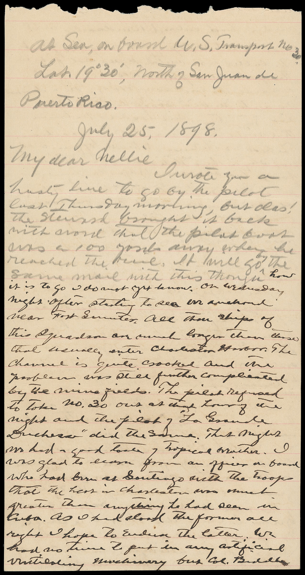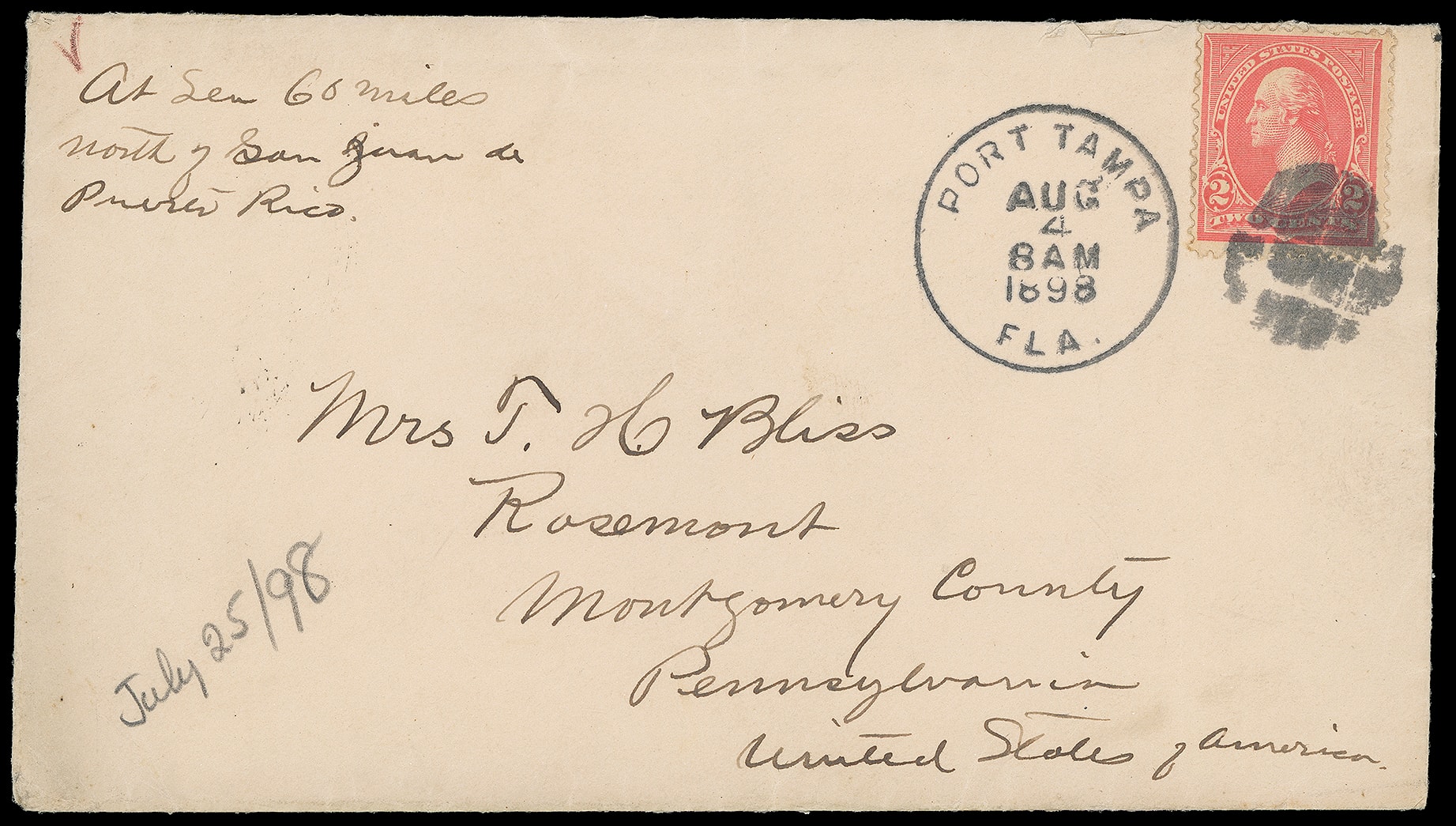 235       image(Pre-Invasion) 1898 (Jul. 25) Letter Written on the Day of the U.S. Invasion of Puerto Rico. Letter datelined "At Sea, on board U.s. Transport No. 30, Lat. 19° 30', North of San Juan de Puerto Rico, July 25, 1898" mentioning sailing from Charleston "…The heat was intense. When the officers could not stay in their Staterooms (and our was four to a stateroom!) You can imagine was what it was for the men down between decks…We expect to meet Gen. Miles with some troops from Santiago and some navy vessels…", mailing cover endorsed "At Sea 60 Miles North of San Juan de Puerto Rico" bearing 2¢ rose carmine (279Bc) tied by "Port Tampa Fla. Aug 4, 1898" cds to Rosemont Pa., Very Fine.
