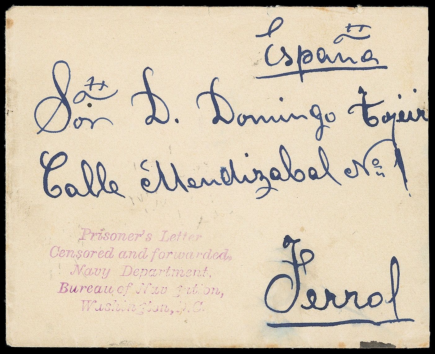 236       image(Prisoner of War) 1898 (Aug.) Portsmouth N.H. to Ferrol, Spain. Stampless cover with purple "Prisoner's Letter Censored and forwarded, Navy Department, Bureau of Navigation, Washington, D.C." five-line handstamp, reverse with Ferrol (8.16.98) arrival cds; barely reduced at right, slightly rough opening at top, Very Fine and scarce prisoner's letter.