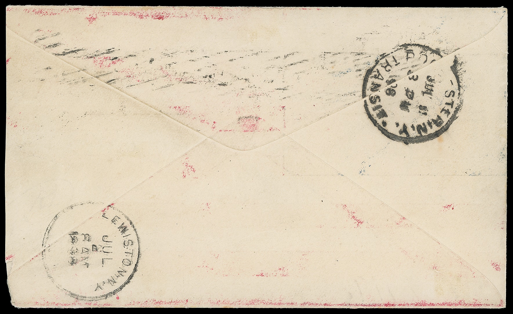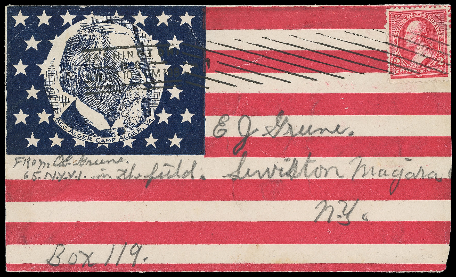 227       imageSec. Alger - Camp Alger, Va. Overall portrait flag design on cover bearing 2¢ rose carmine (279Bc) tied by "Washington D.C., Jun 30 '98" machine cancel to Lewiston N.Y., endorsed from "O.E. Greene, 65 N.Y.V.I. in the Field", Lewiston (7.2) arrival backstamp; reduced at right, some 2¢ abrasion, otherwise Very Fine.