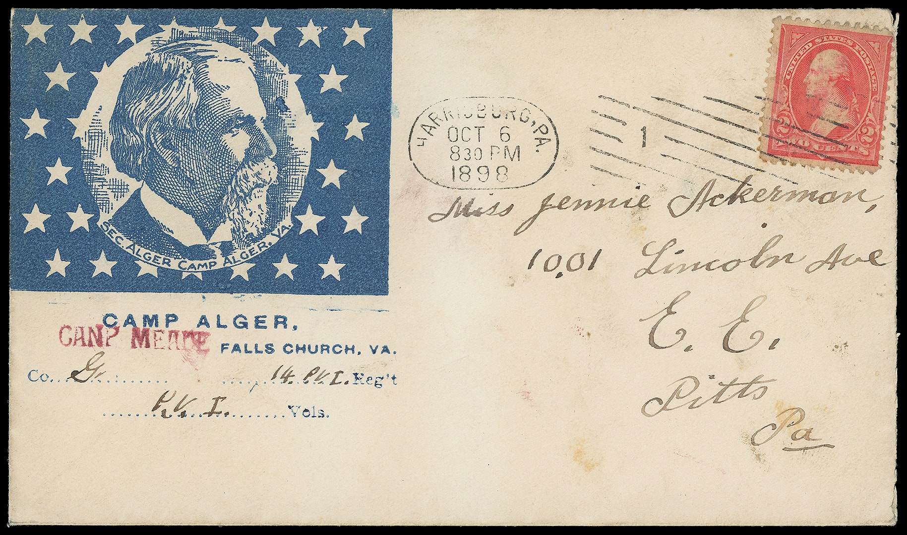 226       imageCamp Alger, Falls Church, Va. Blue Sec. Alger patriotic design on cover bearing 2¢ rose carmine (279Bc) tied by "Harrisburg, Pa. Oct 6, 1898" machine cancel to Pittsburgh Pa., flap sealed with flag stickers; 2¢ torn, otherwise Very Fine and scarce Camp Alger patriotic design.