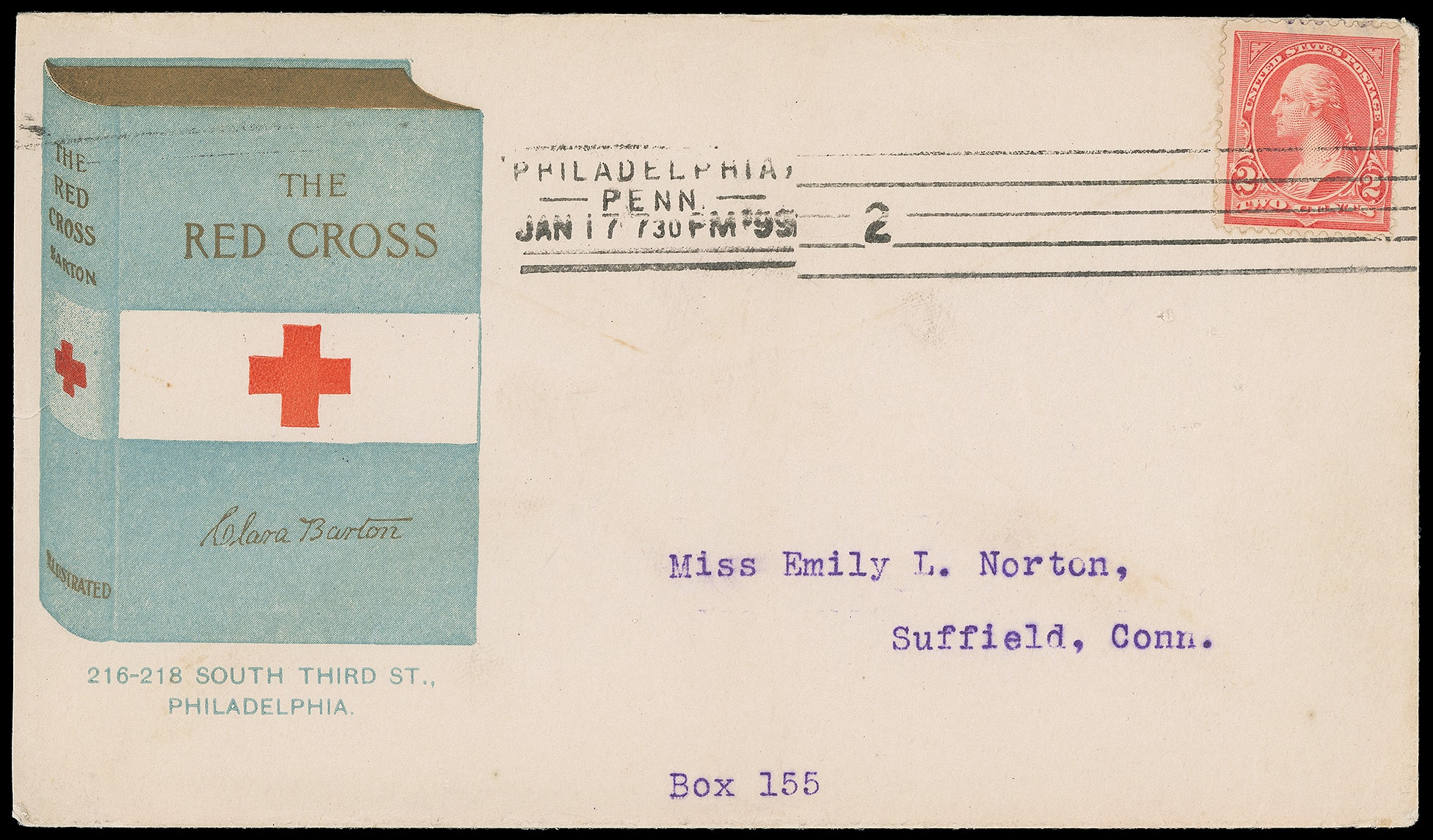 233       image"The Red Cross, Clara Barton". Blue illustrated book corner card on cover bearing 2¢ rose carmine (279Bb) tied by "Philadelphia Penn., Jan 17 '98" machine cancel to Suffield Conn., Jan. 18th arrival backstamp; tiny edge tear at left, Very Fine.