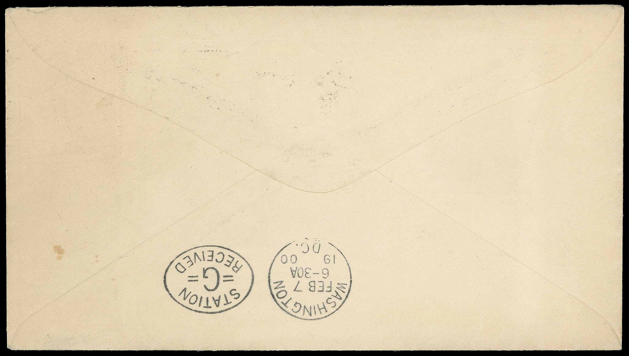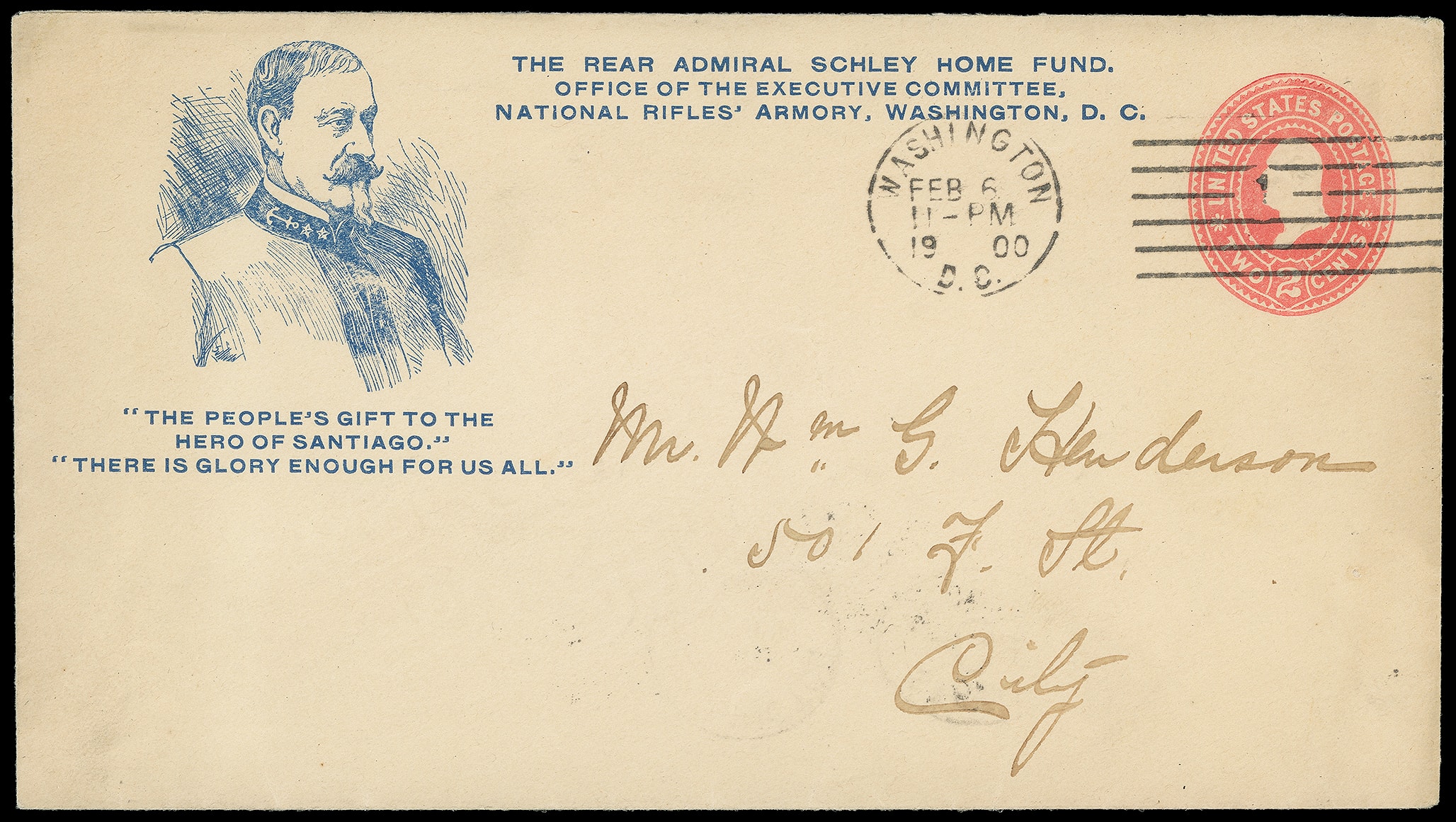 232       imageRear Admiral Schley. Blue patriotic design for Schley Home Fund on 2¢ pink entire canceled by "Washington D.C., Feb 6, 1900" Barry machine cancel to local address, "Station G Received" machine backstamp, Very Fine and scarce Spanish American War patriotic.
