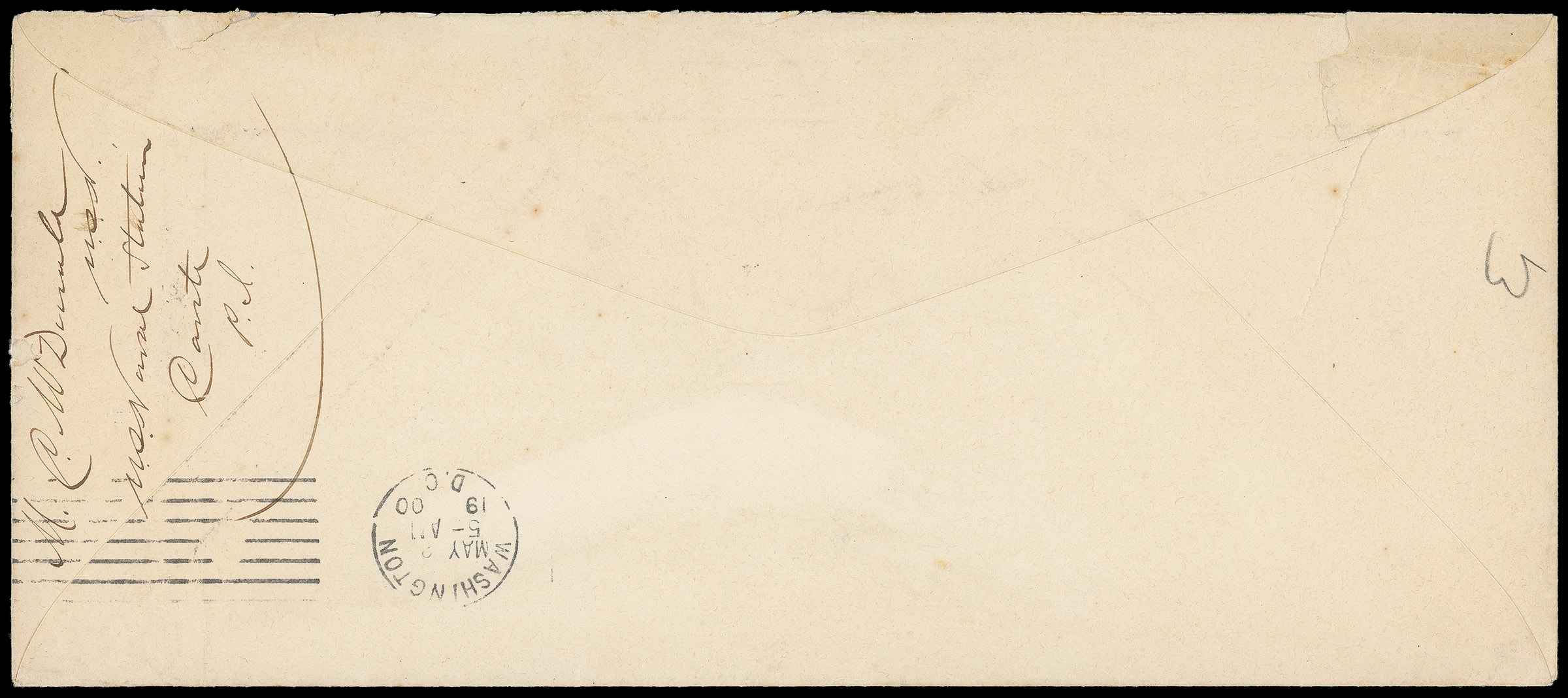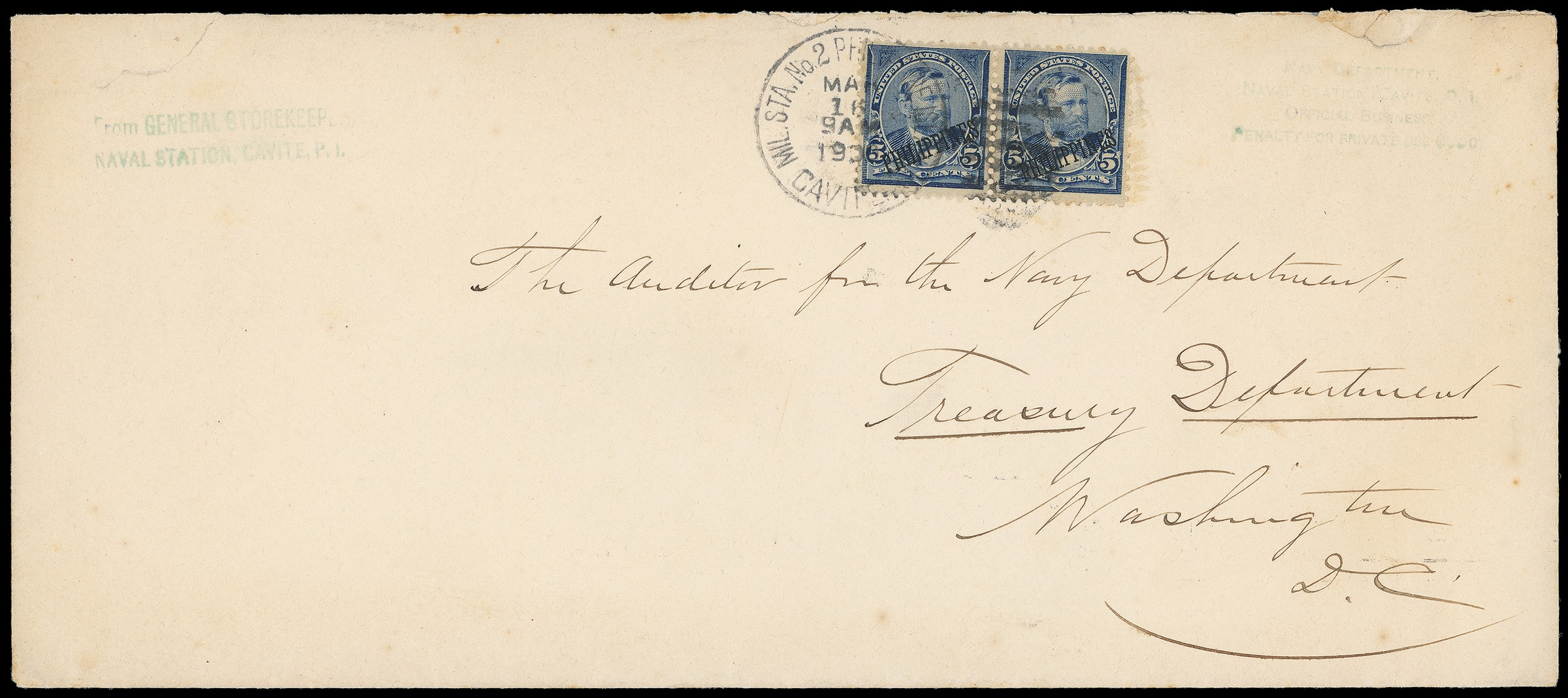 237       image1900 (Mar. 16) Cavite, Philippines to Washington D.C. Legal-size General Storekeeper, Naval Station, Cavite, P.I. penalty cover bearing Philippines, 5¢ blue (216) pair tied by "Mil. Sta. No. 2, Phillippine Islands, Cavite, Mar 16, 1900" duplex to Treasury Department, Washington D.C., reverse with "Washington D.C., May 2, 1900" Barry machine receiving backstamp; opening tears, F.-V.F.