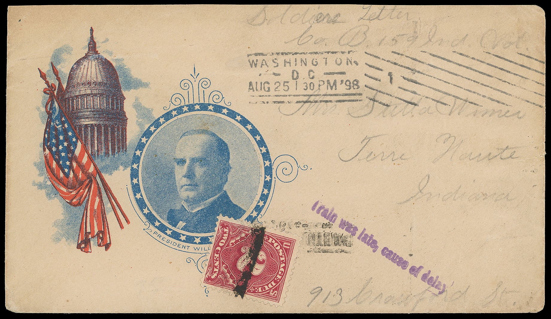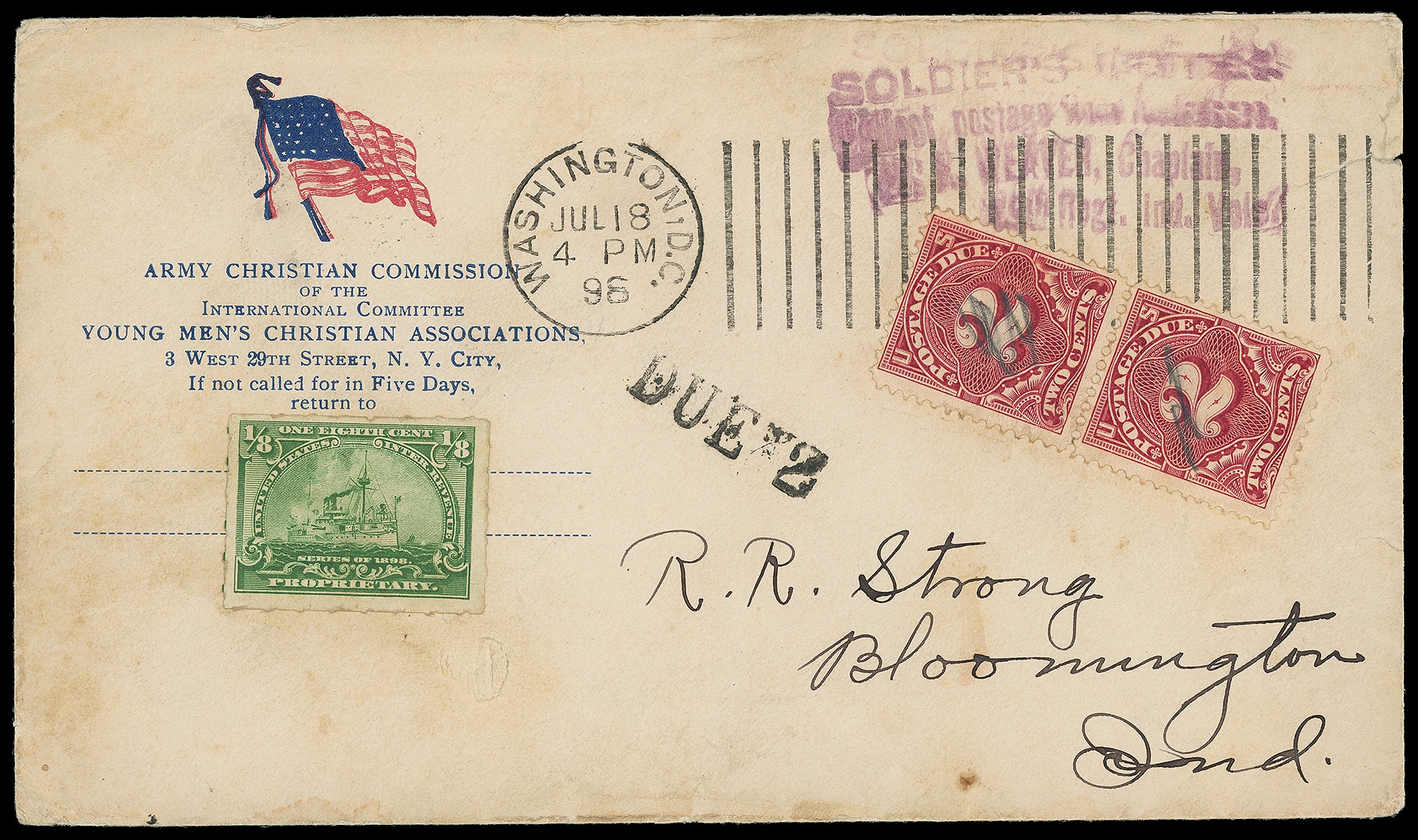 230       imageFlag YMCA. Incoming Army Christian Commission patriotic envelope with purple "Soldier's Letter, Without postage charge address / Chaplain" handstamp, entered mails with "Washington, D.C. Jul 18 '98" Barr-Fyke machine cancel to Bloomington Ind., "Due 2" handstamp and pencil cancelled 2¢ postage due vertical pair affixed, 1898 1/8 proprietary battleship issue affixed in return address portion, Jul. 20th receiving backstamp; small faults, Fine, ex-Hahn.