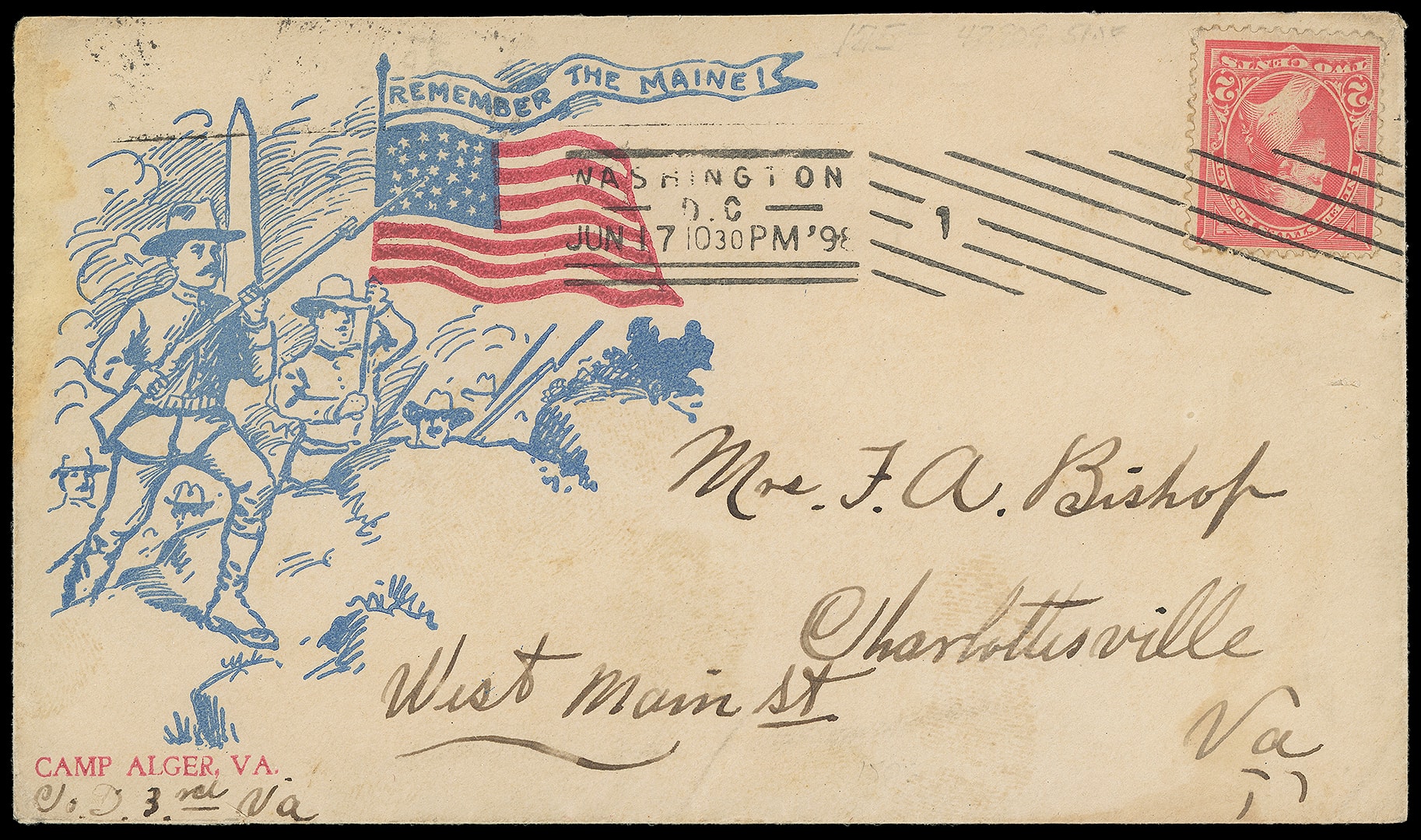 238       imageWashington D.C. - Spanish American War Camp Algers. Group of 15 Camp Algers uses or patriotic designs, note Sec. Alger - Camp Alger Va. overall flag patriotic design, Soldiers with Wash. Monument in Background and "Remember the Maine Banner" two examples with slightly different Camp Alger imprints, several Camp Alger imprints including Flags designs; some mixed condition, F.-V.F. group.