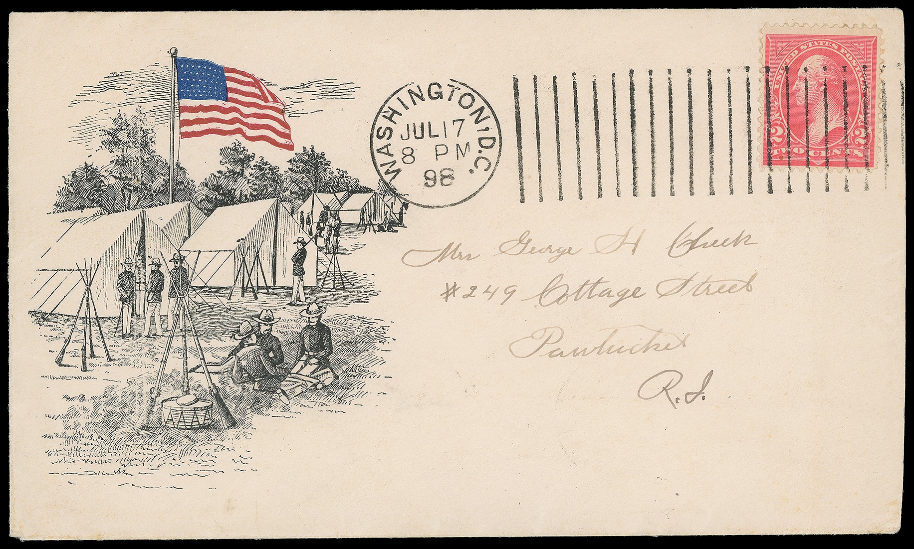 228       imageCamp Scene with Flag. Detailed patriotic design on cover bearing 2¢ rose carmine (279Bc) tied by bold "Washington, D.C. Jul 17, 98" Barr-Fyke machine cancel to Pawtucket R.I., July 18th flag machine arrival backstamp; reduced slightly at right, Extremely Fine and rare design.