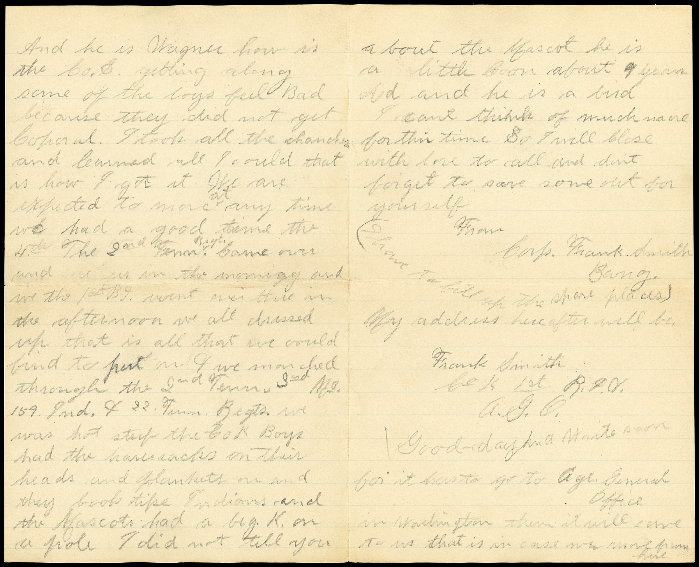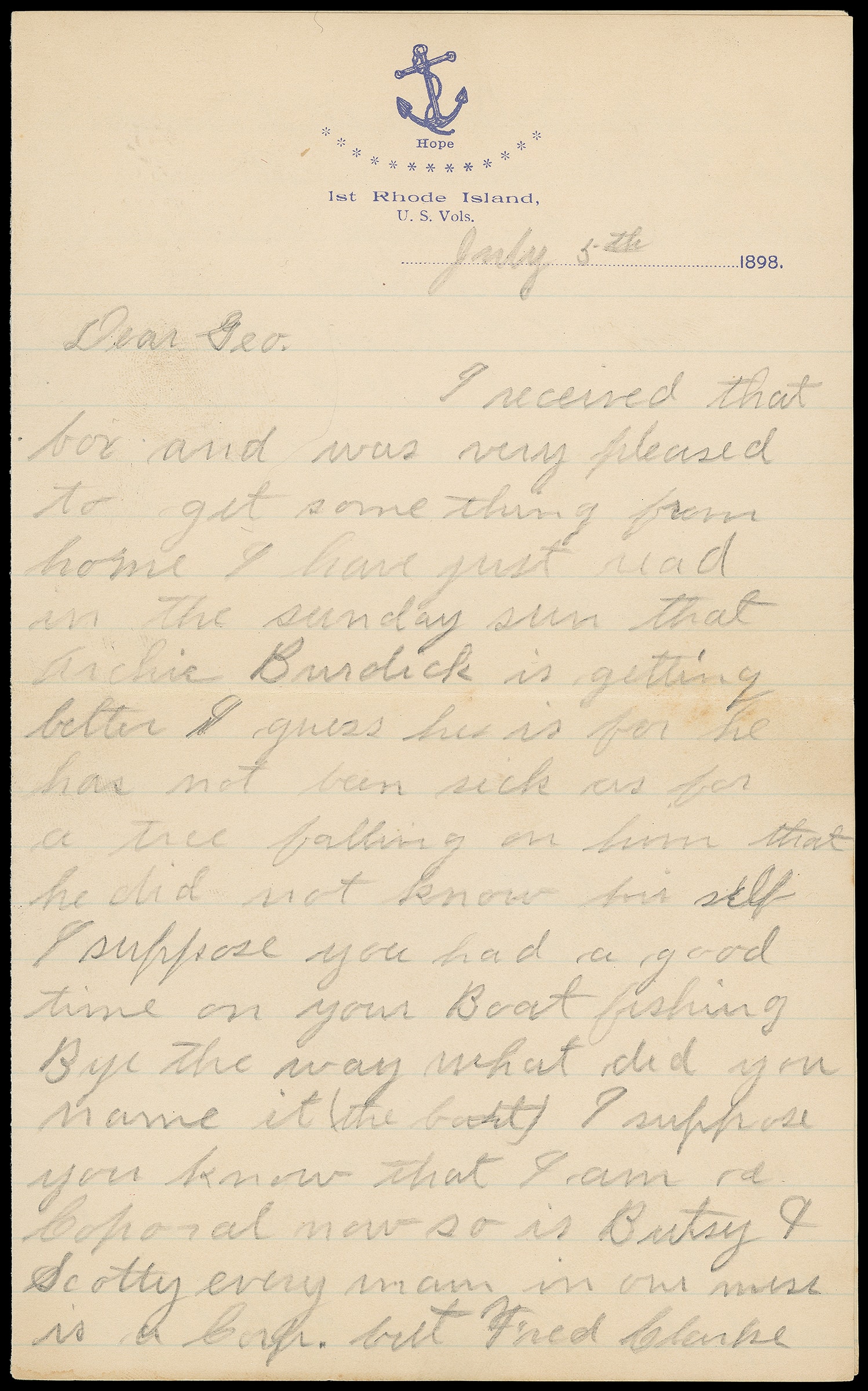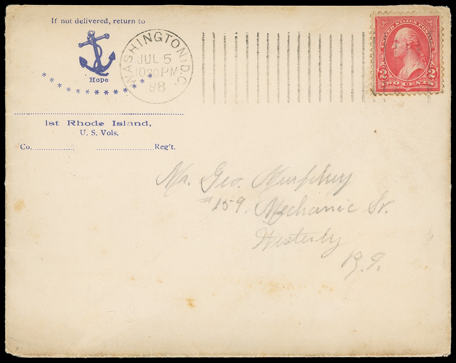 231       image"Hope, 1st Rhode Island, U.S. Vols." . Blue anchor patriotic design on cover bearing 2¢ rose pink (279B) tied by "Washington D.C. Jul 5 '98" machine cancel to Westerly R.I., matching letterhead enclosure from Corporal with some interesting content "…we expect to move at any time, we had a good time the 4th. The 2nd Tenn. Regt. came over and all us in the morning and we the 1st R.I. went over there in the afternoon, we all dressed up… & we marched through the 2nd Tenn., 3rd N.J., 159. Ind. & 22. Tenn. Regts. We was hot stuff the Co. K boys had the haversacks on their heads and blankets on and the look like Indians and the Mascots had a big K on a pole…", Very Fine.
