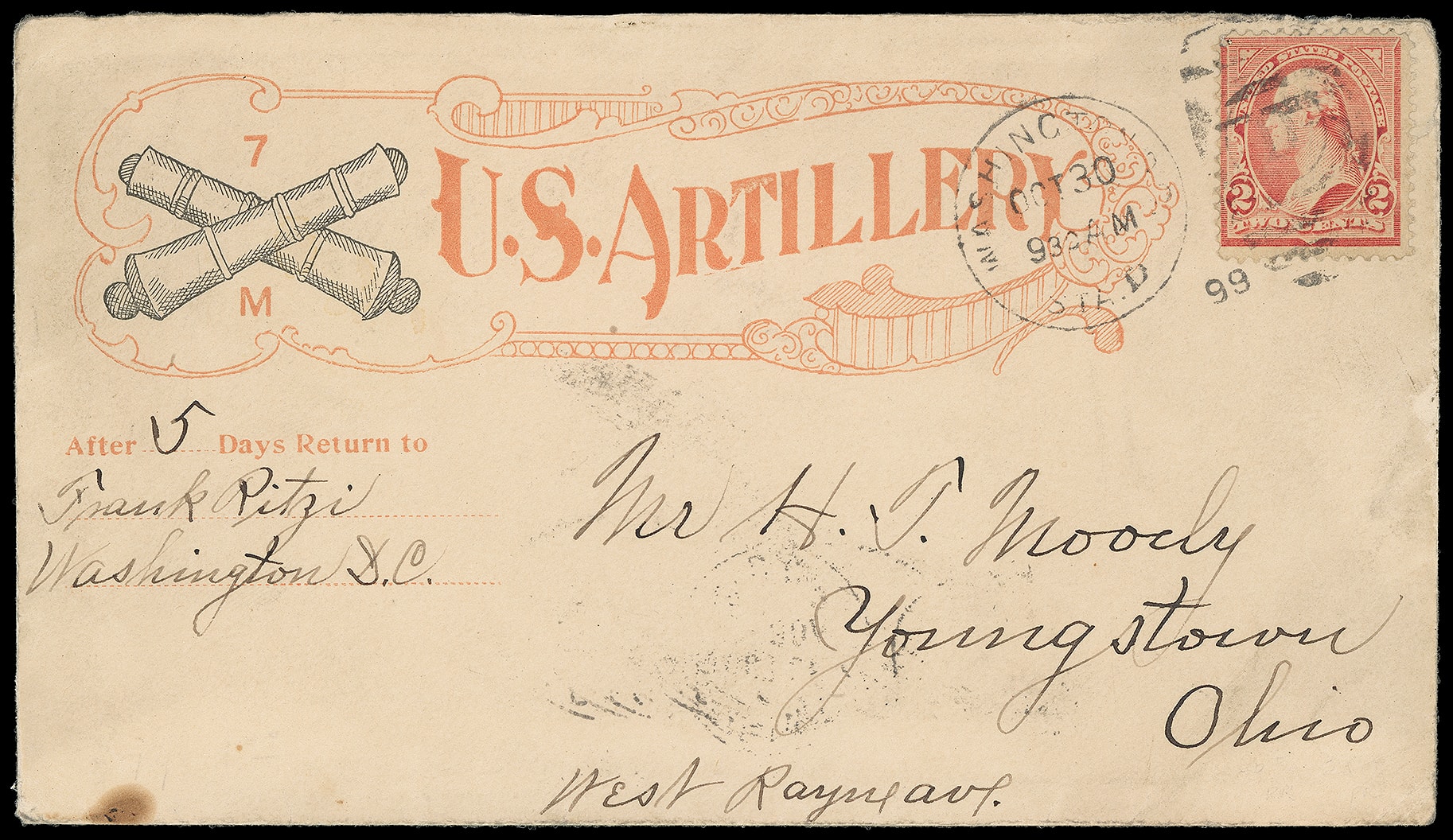 234       imageU.S. Artillery. Patriotic design showing crossed cannons on cover bearing 2¢ carmine (279B) tied by "Washington D.C., Sta. D, Oct 30 '99" duplex to Youngstown Ohio, Oct. 31st machine arrival; tone spot bottom left, F.-V.F.