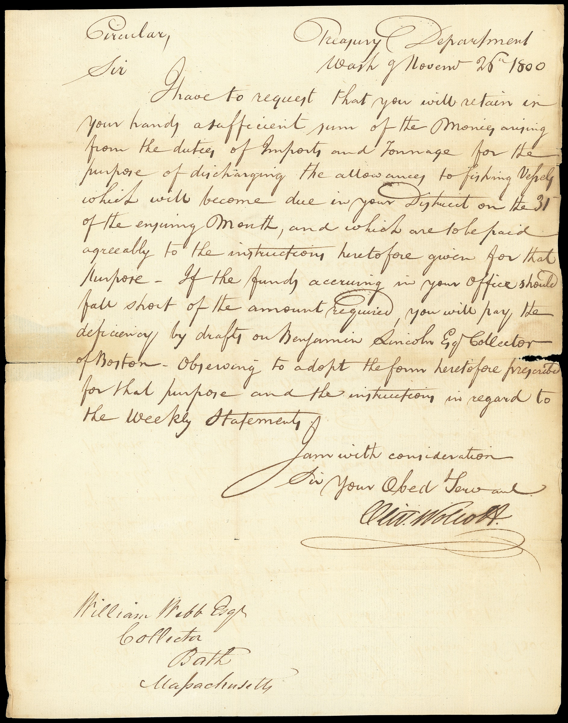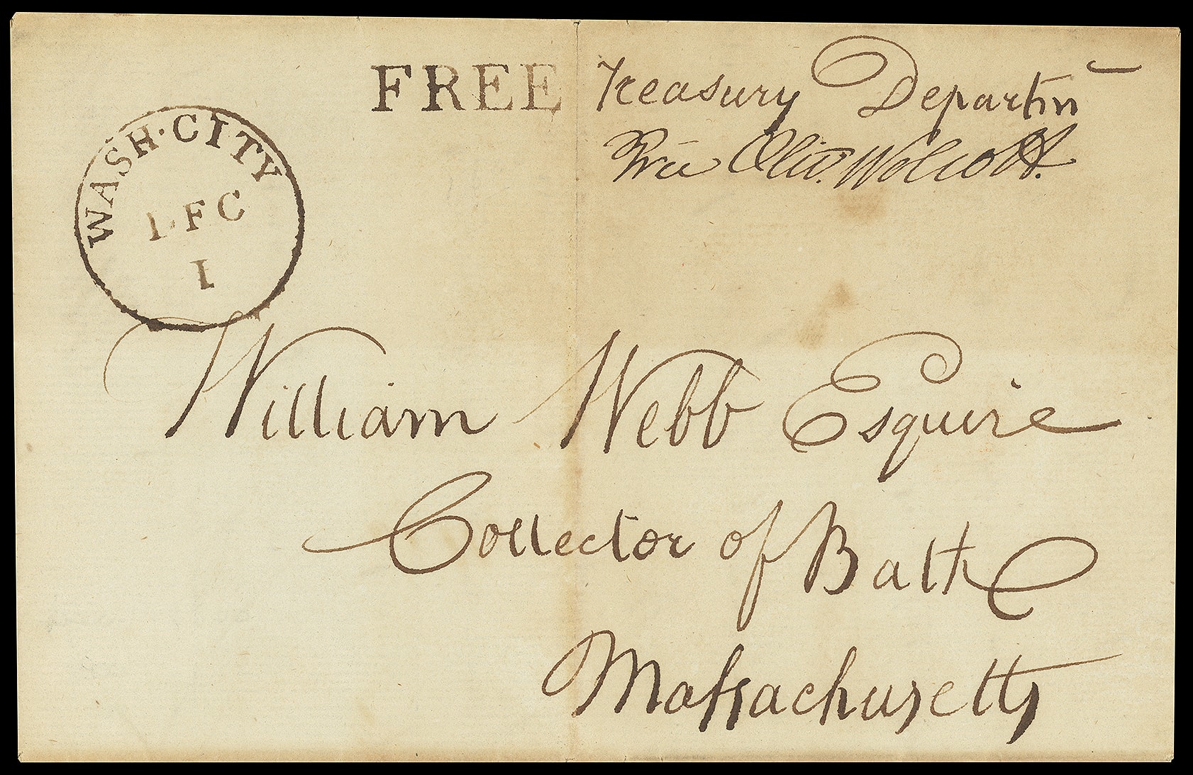 21       image(Secretary of the Treasury) Oliver Wolcott. Free frank "Free Oliv. Wolcott" as Secretary of the Treasury on 1800 folded letter with "Wash. City, Dec 1" bold cds and matching "FREE" rating handstamp to Customs Collector at Bath, District of Massachusetts; file fold, some toning, F.-V.F.