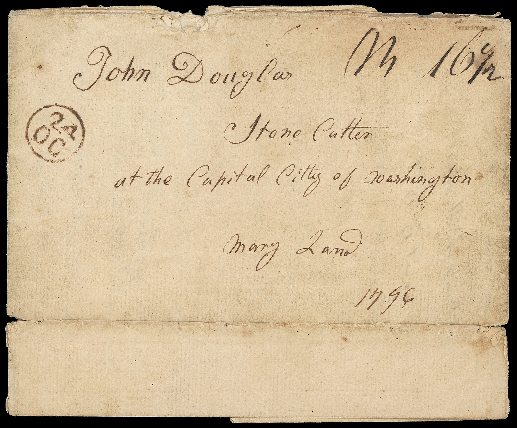 37       image1796 (Aug. 16) London, England To Washington, D.C. Folded letter datelined "Great Bath Street, August 16, 1796" and addressed to "John Douglas, Stone Cutter, at the Capital Citty of Washington, Mary Land", entered mails with Philadelphia "24 OC" Franklin mark and manuscript "Sh 16½" ship letter rating, letter from Douglas's sister with good content describing her difficulty of finding a husband and advising her brother not to get a wife there, "for by your description of the women, they are not very agreeable creatures" and suggesting she come to America where she could get a husband asking whether "the people have any particular form of religion"; small paper loss at top edge and partial fold separations, Fine, A scarce and very early use to a Washington D.C. stone cutter engaged in the construction of government buildings that were not occupied until 1800.